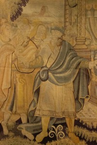 English Renaissance style horizontal tapestry of seated English Lord with standing noblemen and other figures.
