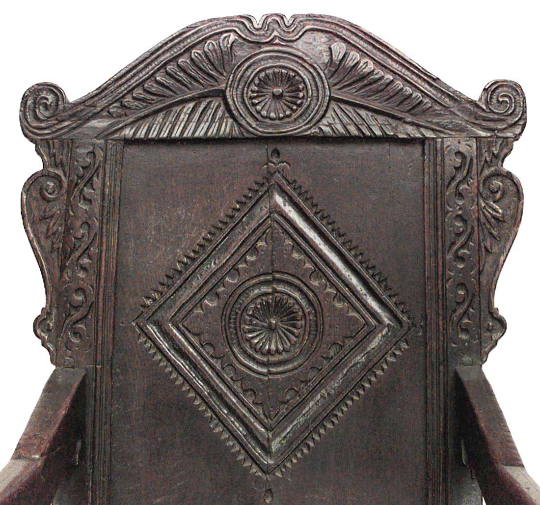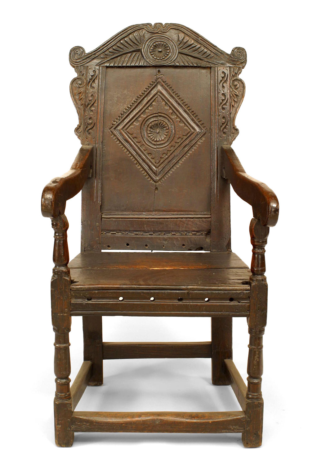 English Renaissance (17th Cent) Wainscot style oak arm chair with diamond designed carved back. (repairs to back)