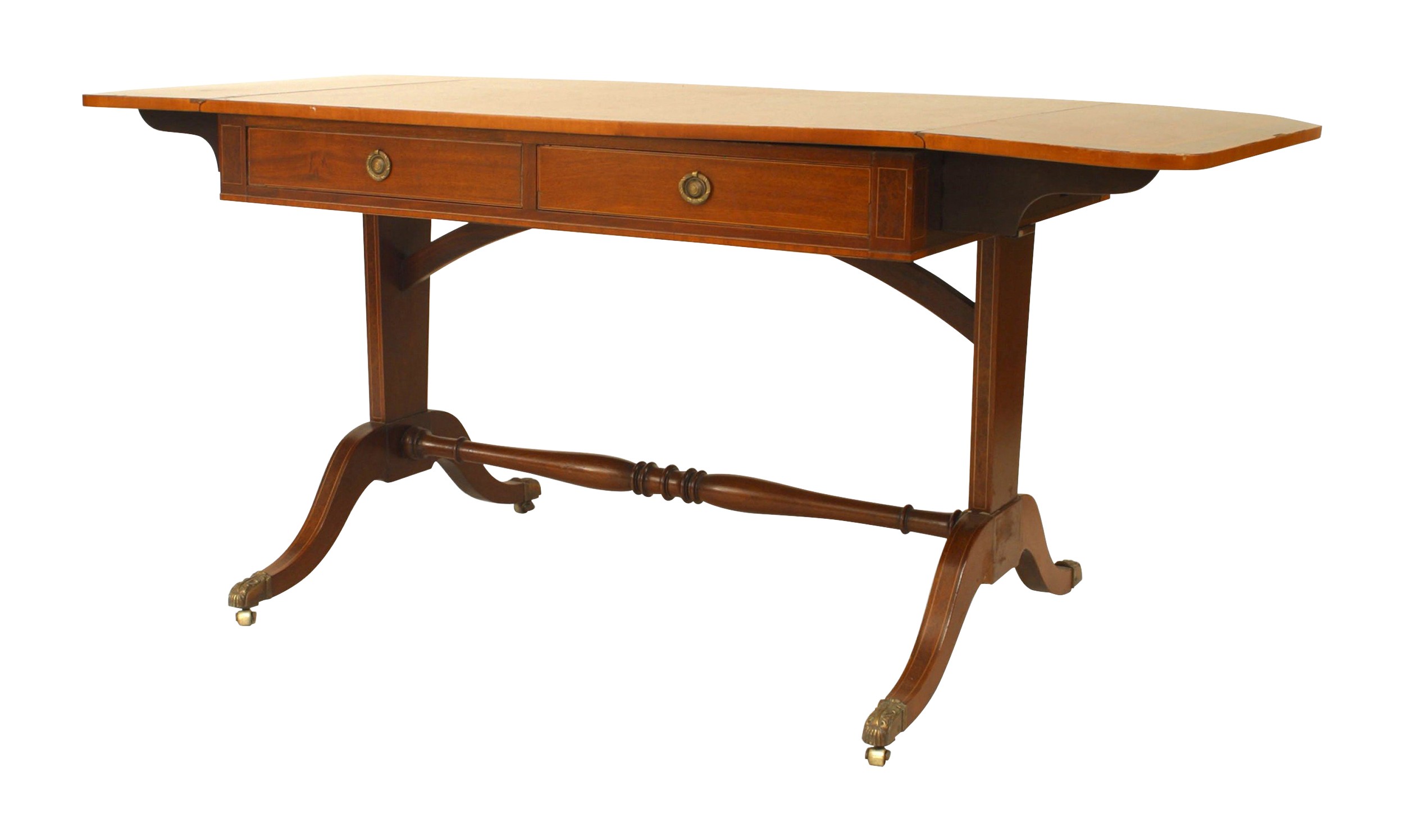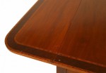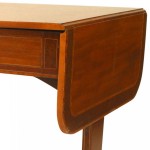 English Sheraton style (19/20th Century) mahogany davenport table with drop sides and inlaid border with 2 drawers. (Leaves open 59.5 width / depth 28.5 ,Leaves closed 37.5 width / depth 28.5.).
