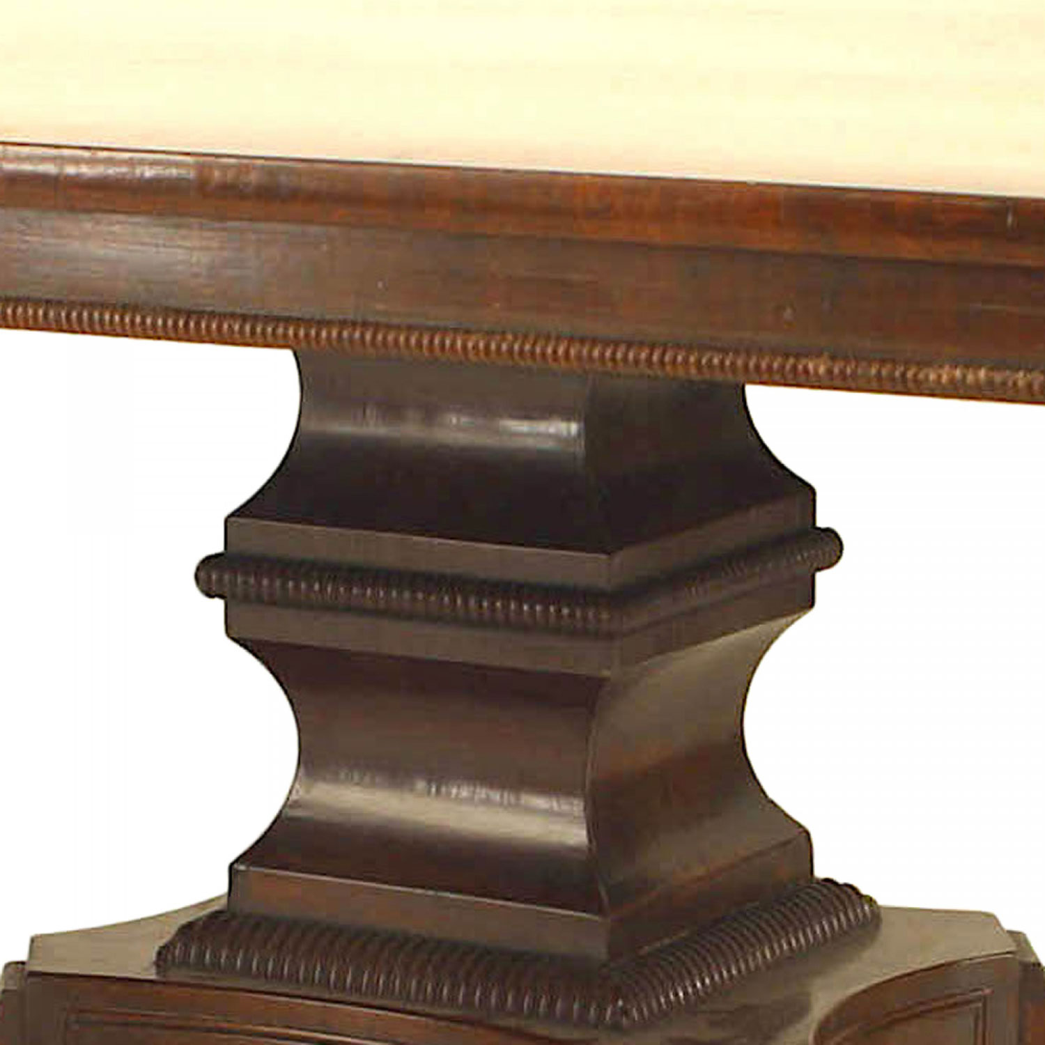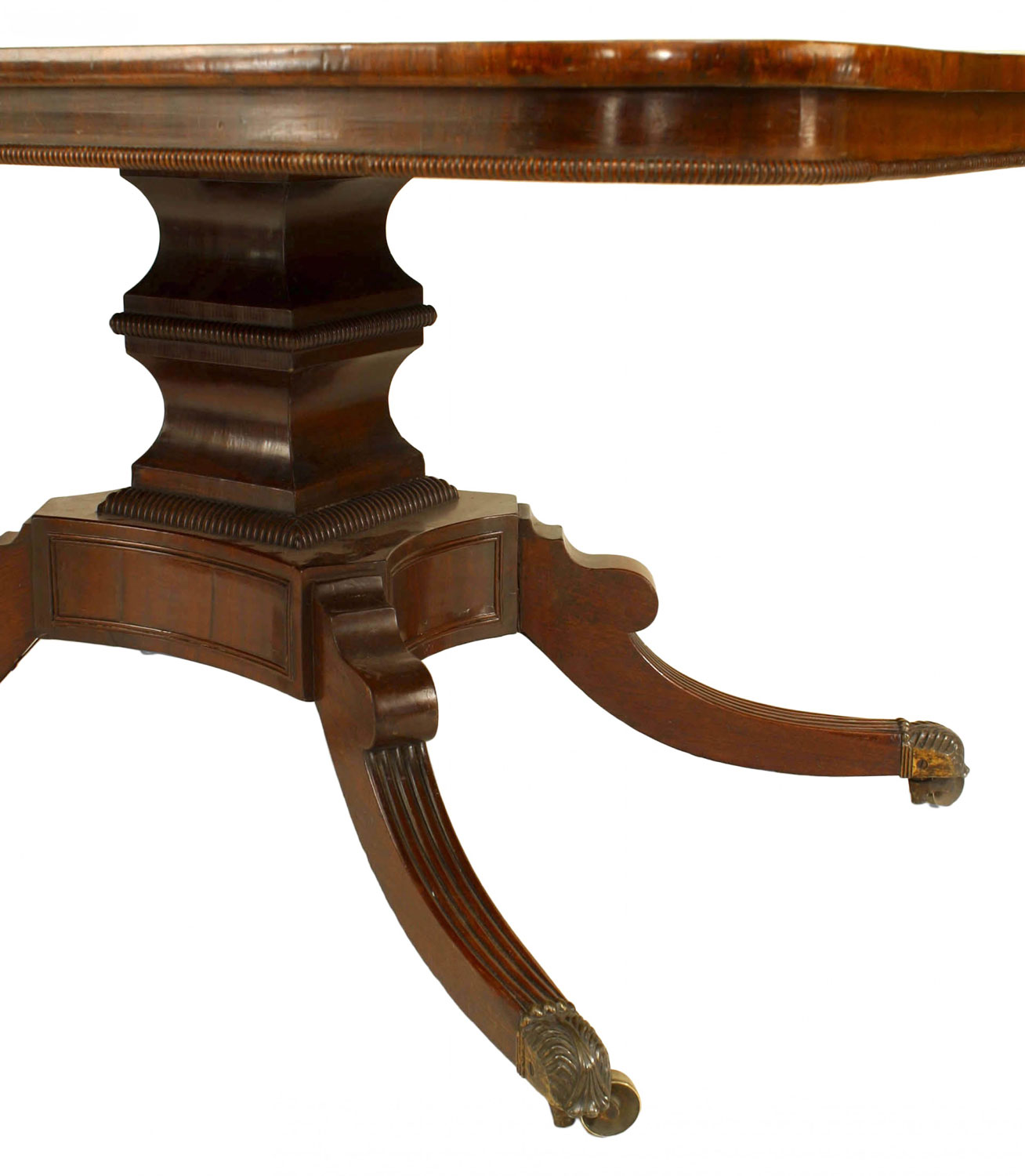 English Sheraton (19th Century) mahogany rectangular dining table with a carved beaded edge apron & supported on a pedestal base with 4 fluted legs ending in brass feet..