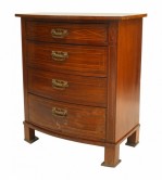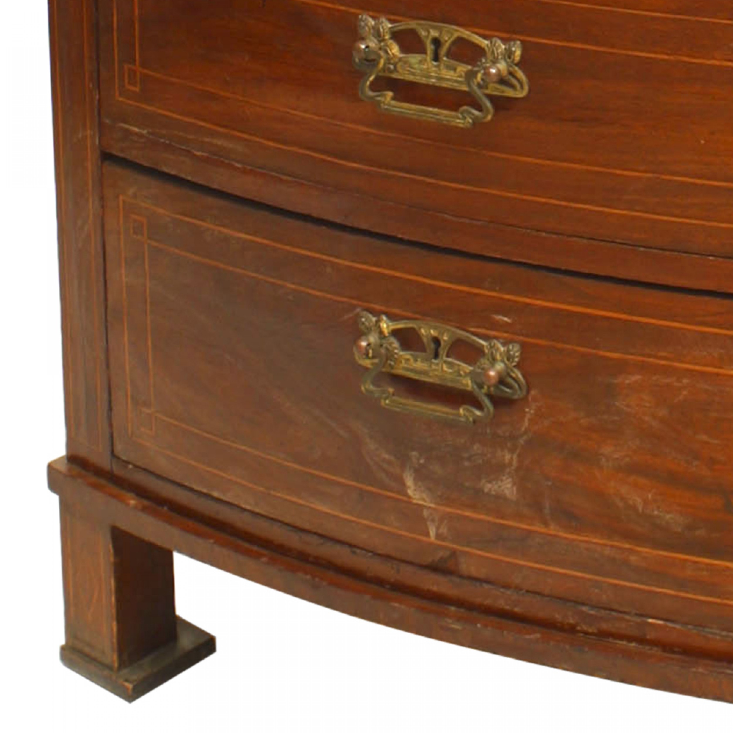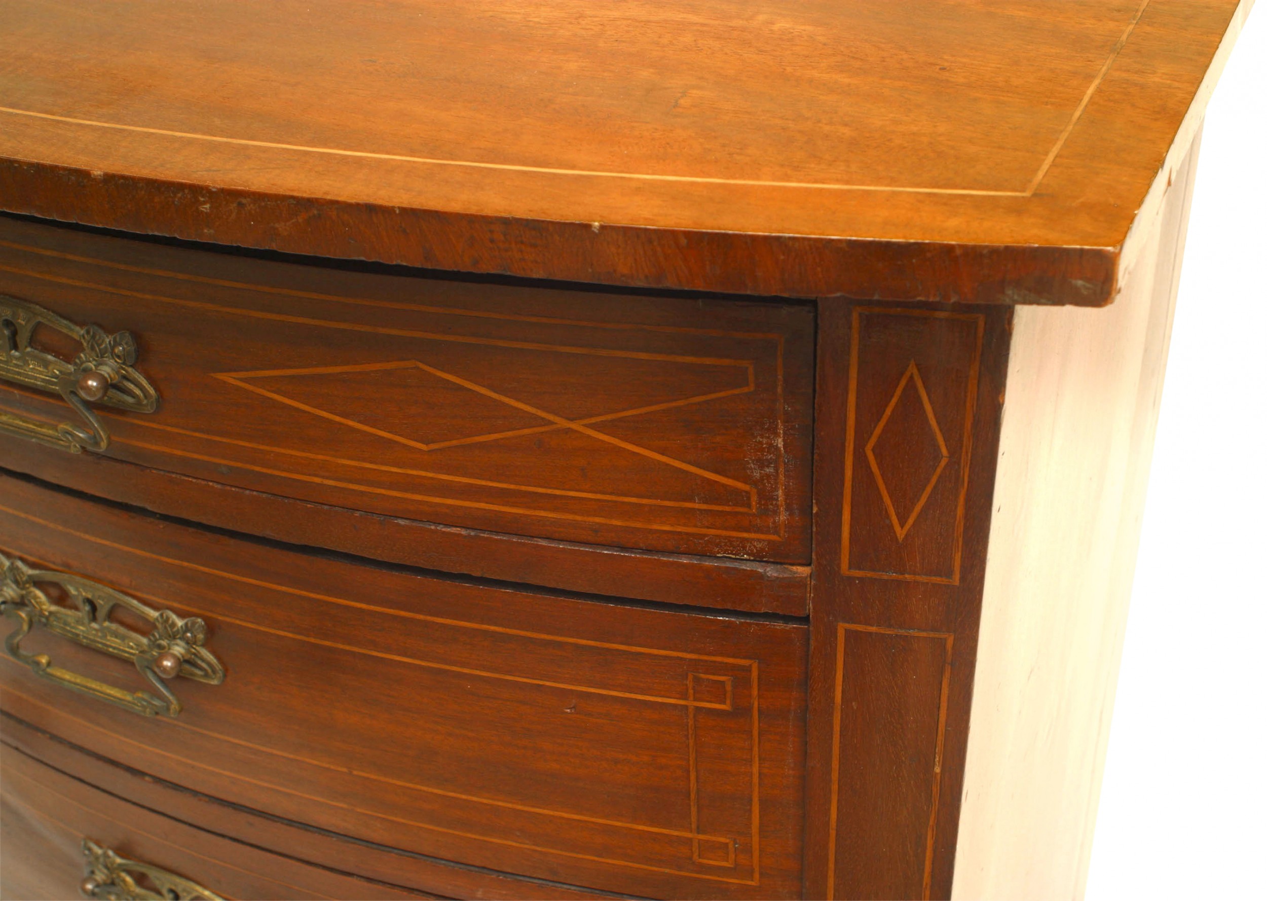English Sheraton style (19th Century, hardware replaced) mahogany bow front small chest with 4 drawer and banded satinwood inlay design.