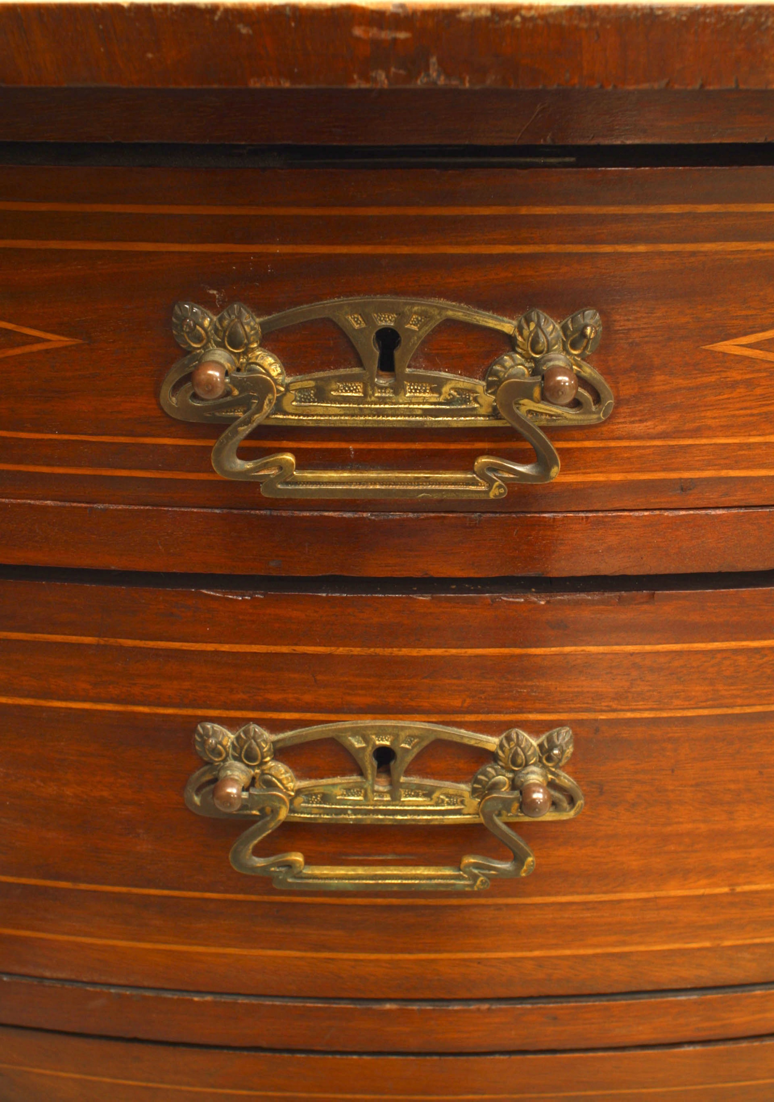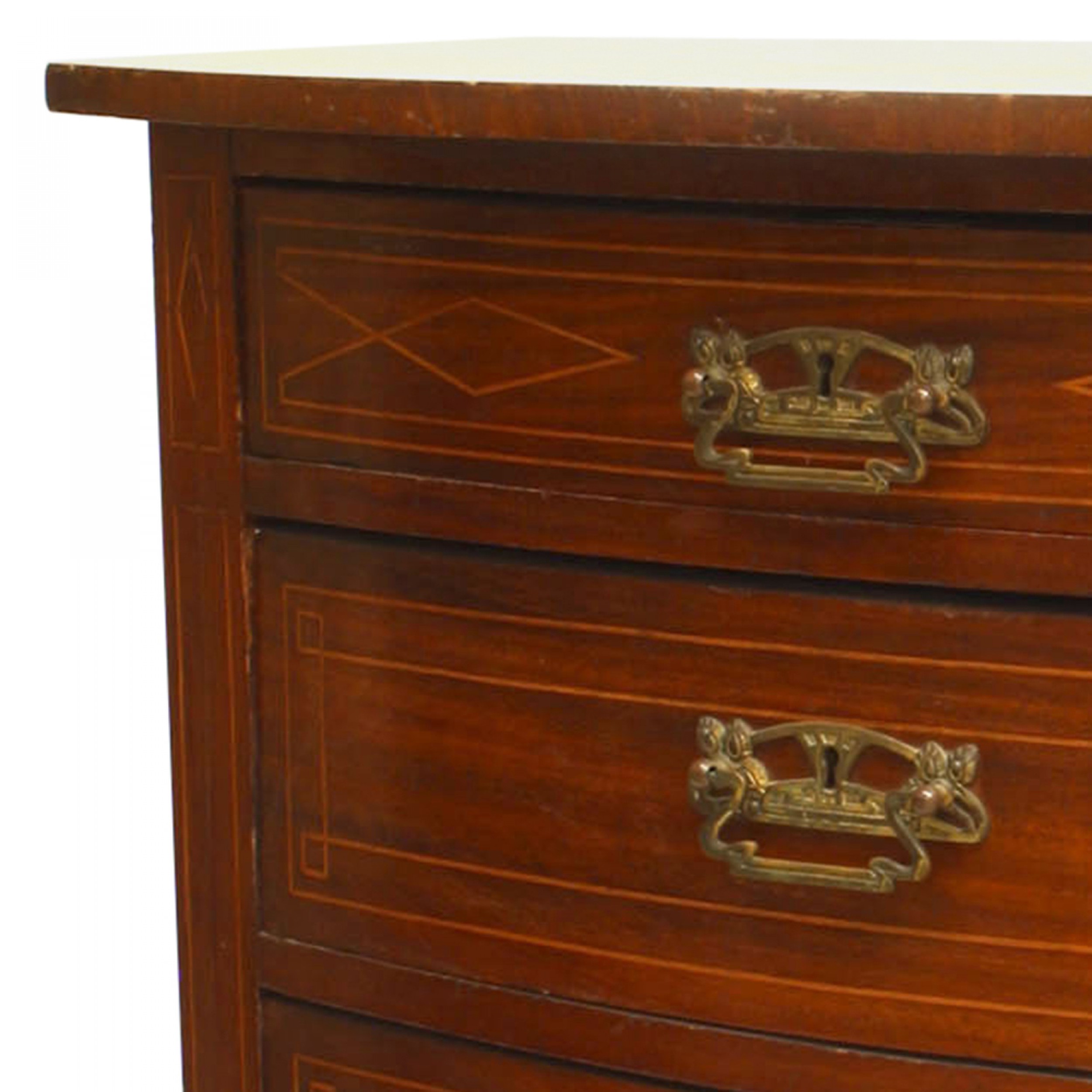 English Sheraton style (19th Century, hardware replaced) mahogany bow front small chest with 4 drawer and banded satinwood inlay design..
