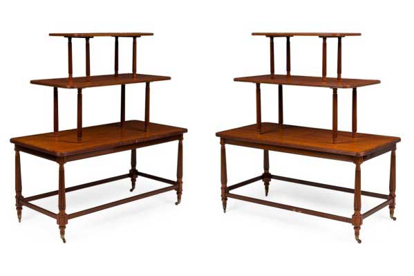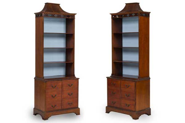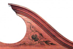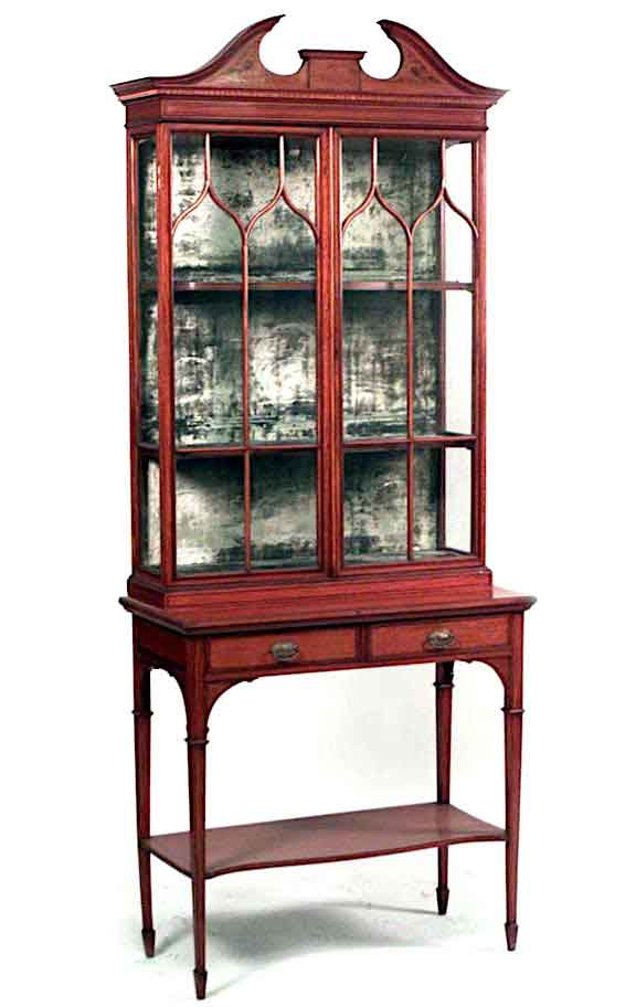 Style: English Materials & Techniques: Glass, wood, satinwood, arch, inlaid, pediment Category: Cabinets & Case Goods