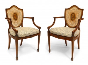 Pair of English Sheraton Satinwood Shield Armchairs