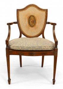 PAIR of English Sheraton style (19th Cent) satinwood shield back Armchairs with painted and cane back panels.