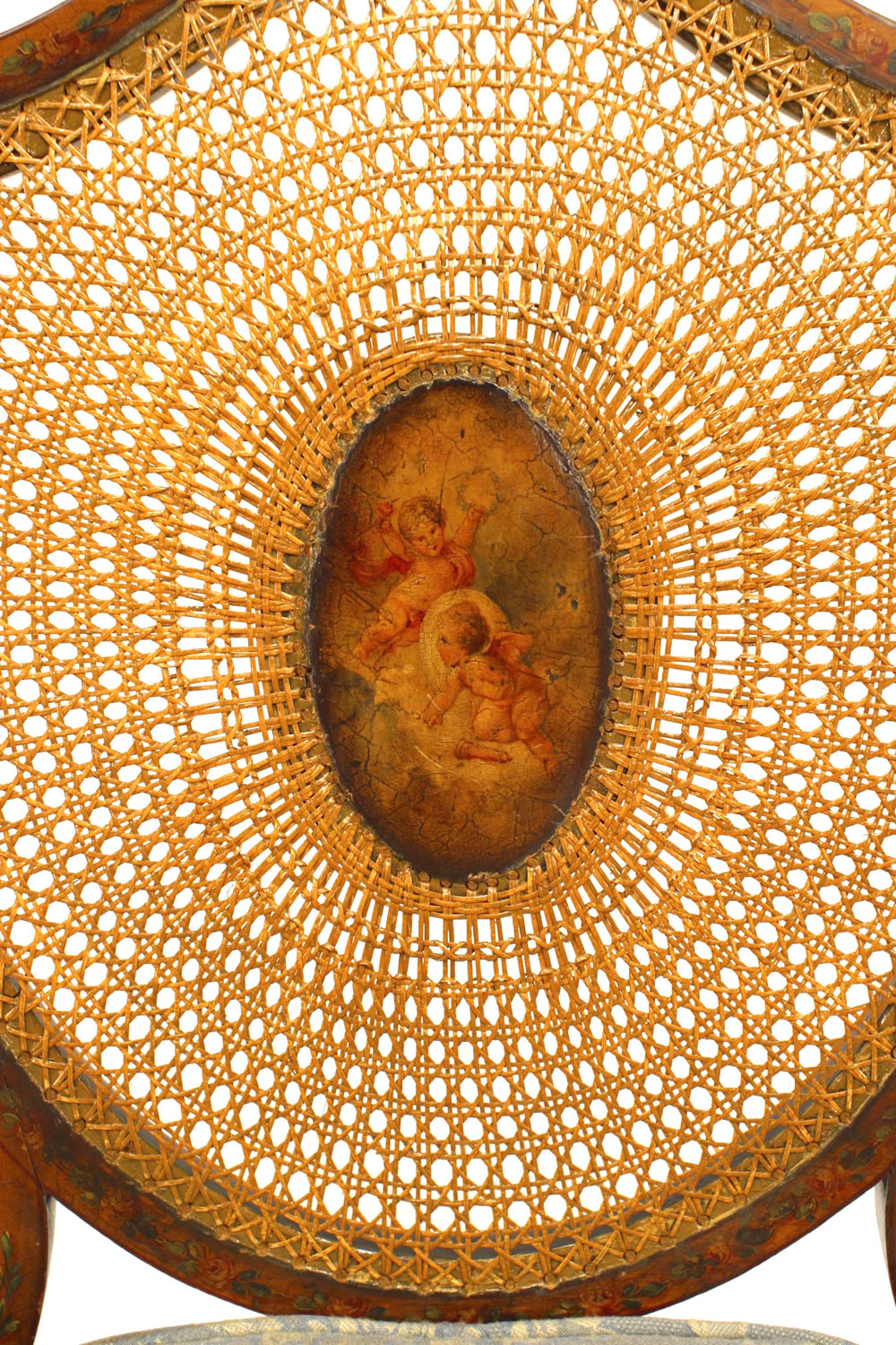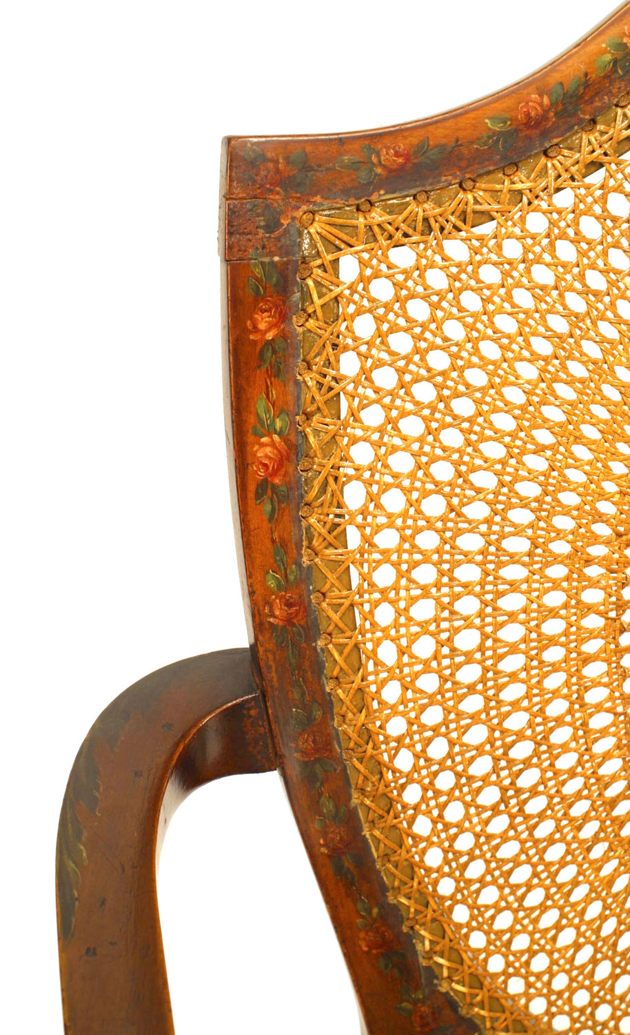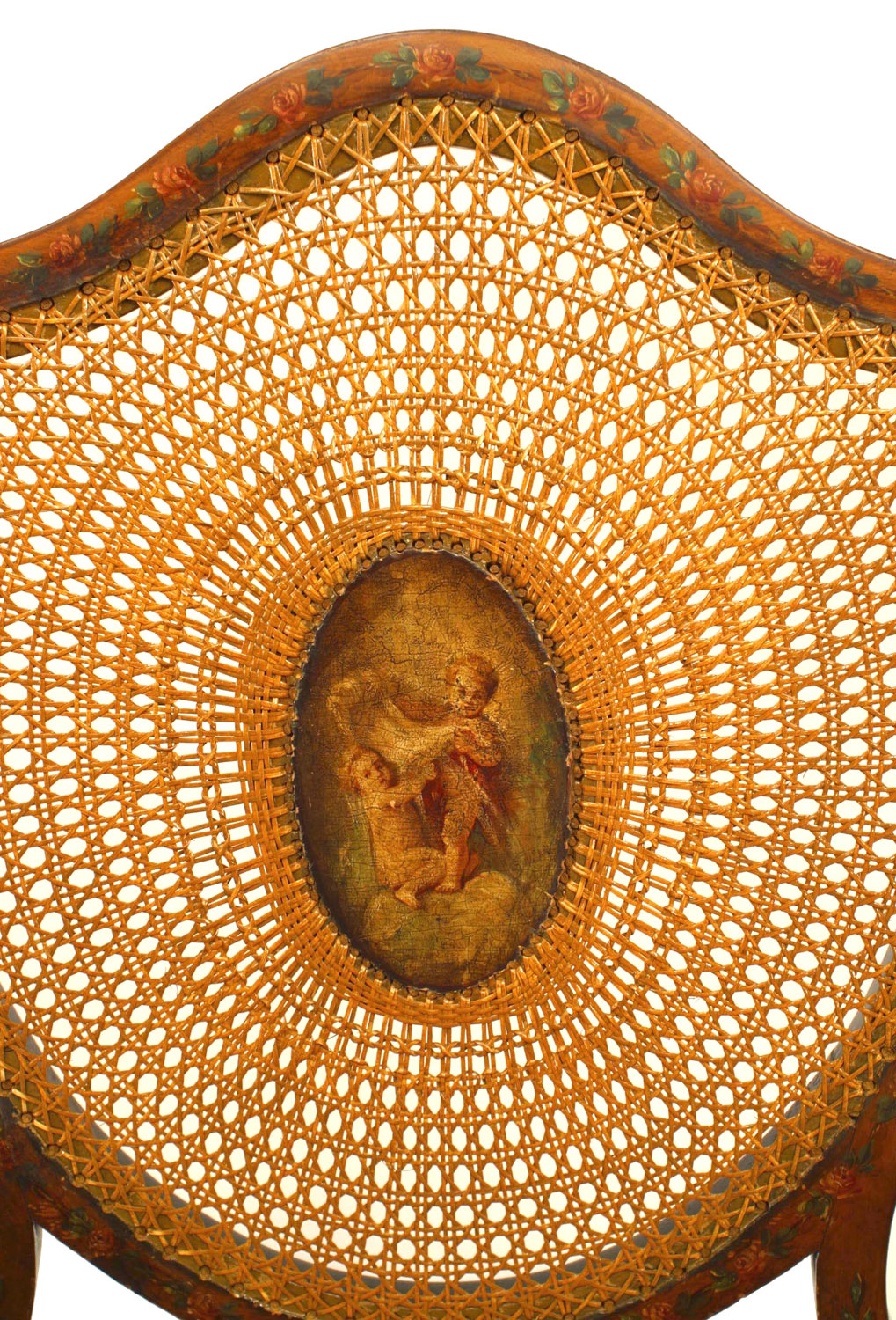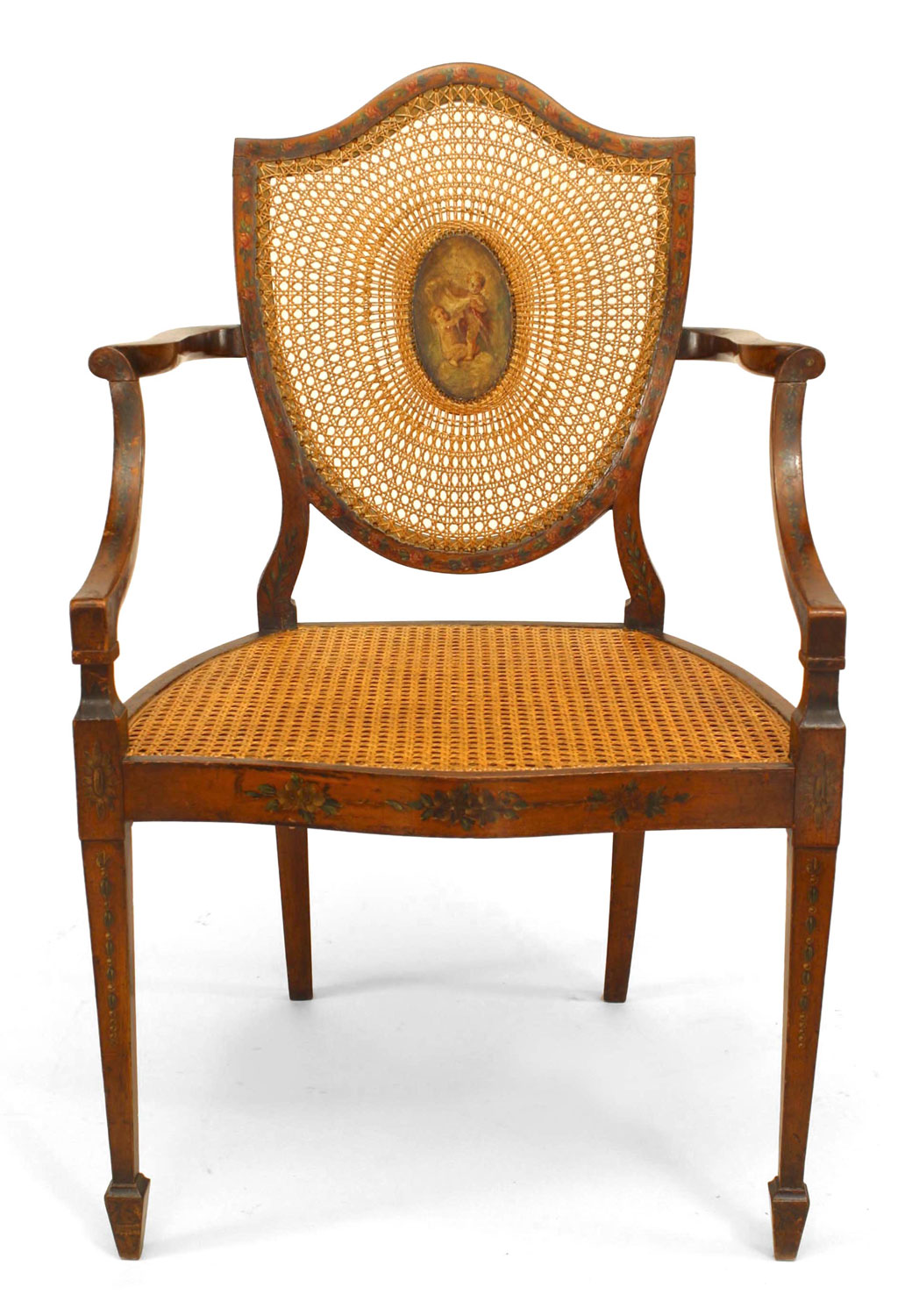 PAIR of English Sheraton style (19th Cent) satinwood shield back Armchairs with painted and cane back panels..