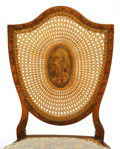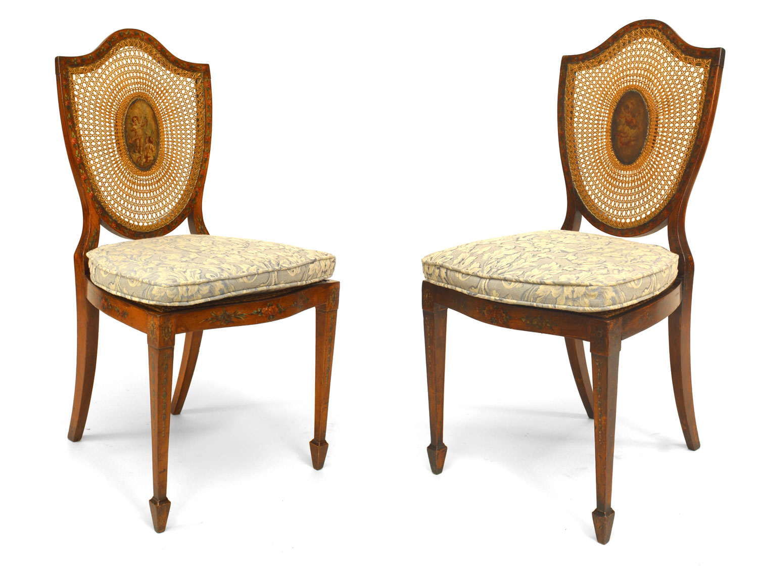 PAIR of English Sheraton style (19th Cent) satinwood shield back side chairs with painted and cane back panels.