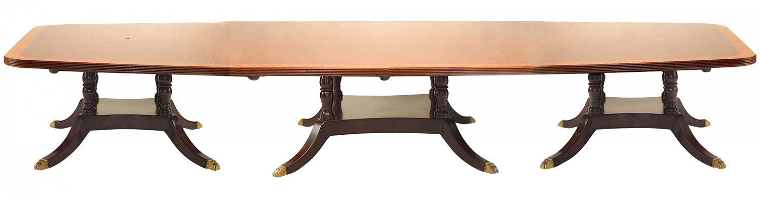 English Sheraton-style (20th Century) mahogany conference table with banded edge and bowed center in 4 sections on 3 splay foot pedestal bases with brass lion paw feet (KITTINGER)