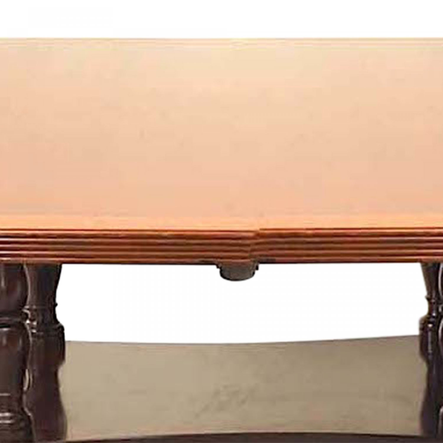 Style: English Materials & Techniques: Brass, mahogany Category: Tables, Office/Library, Dining Room Condition: Additional Dimensions: Table has 4 sections. Each Section is 54 inches wide. The End Sections are 70 inches deep at the end, 86 inches deep where it connects with the Center Sections. The Center Sections are 86 inches deep and then 90 inches deep where they meet. nn 90 inches deep at the center which tapers to 70 inches at the ends. The top shows wear and tear.
