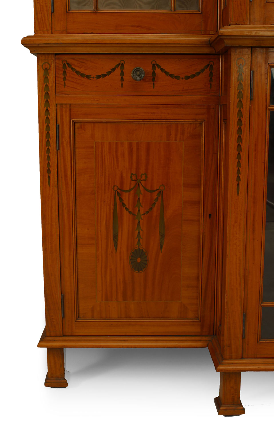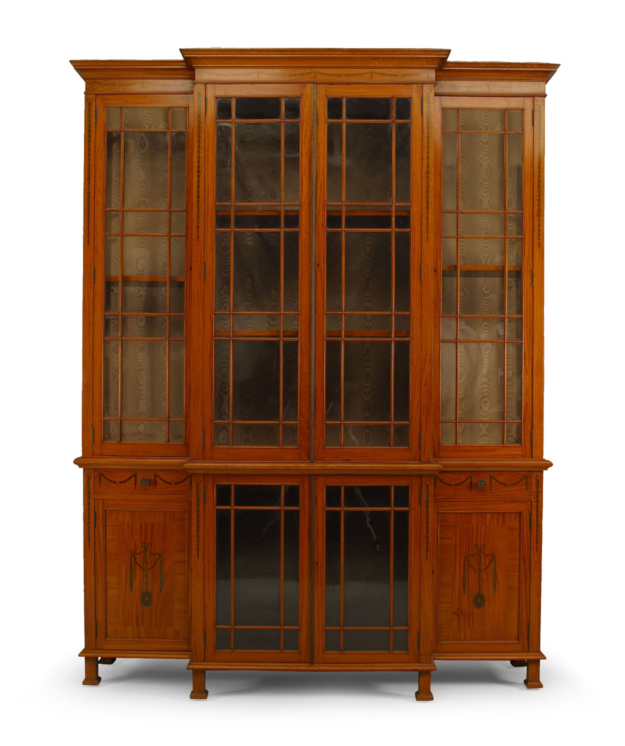 English Sheraton-style (19th Century) satinwood breakfront cabinet with lattice doors and sides and inlaid festoon and trim with 14 shelves.