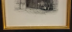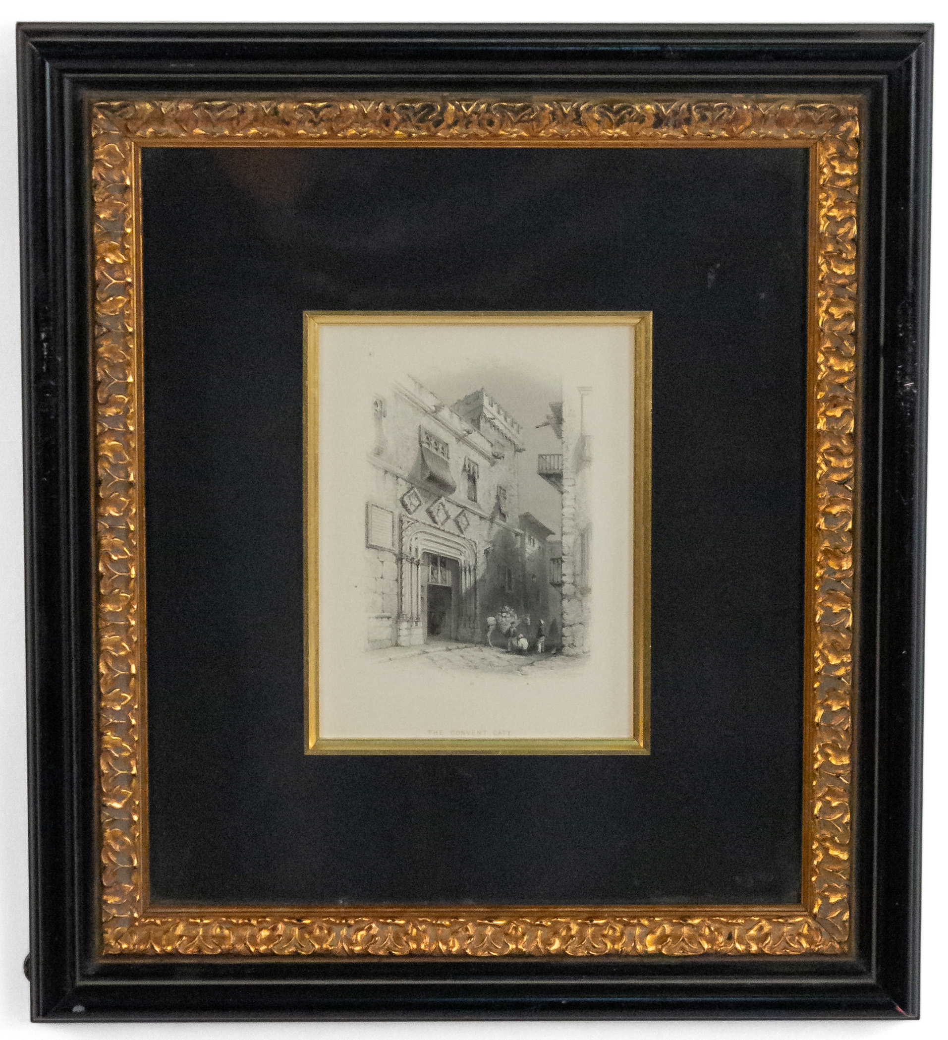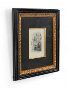 English Victorian steel plate engraving of a streetscape (19th-Century) in a black and gold decorative frame. Written on back of frame: (1856 // England). (Similar to MP22344).