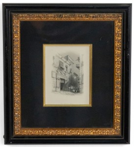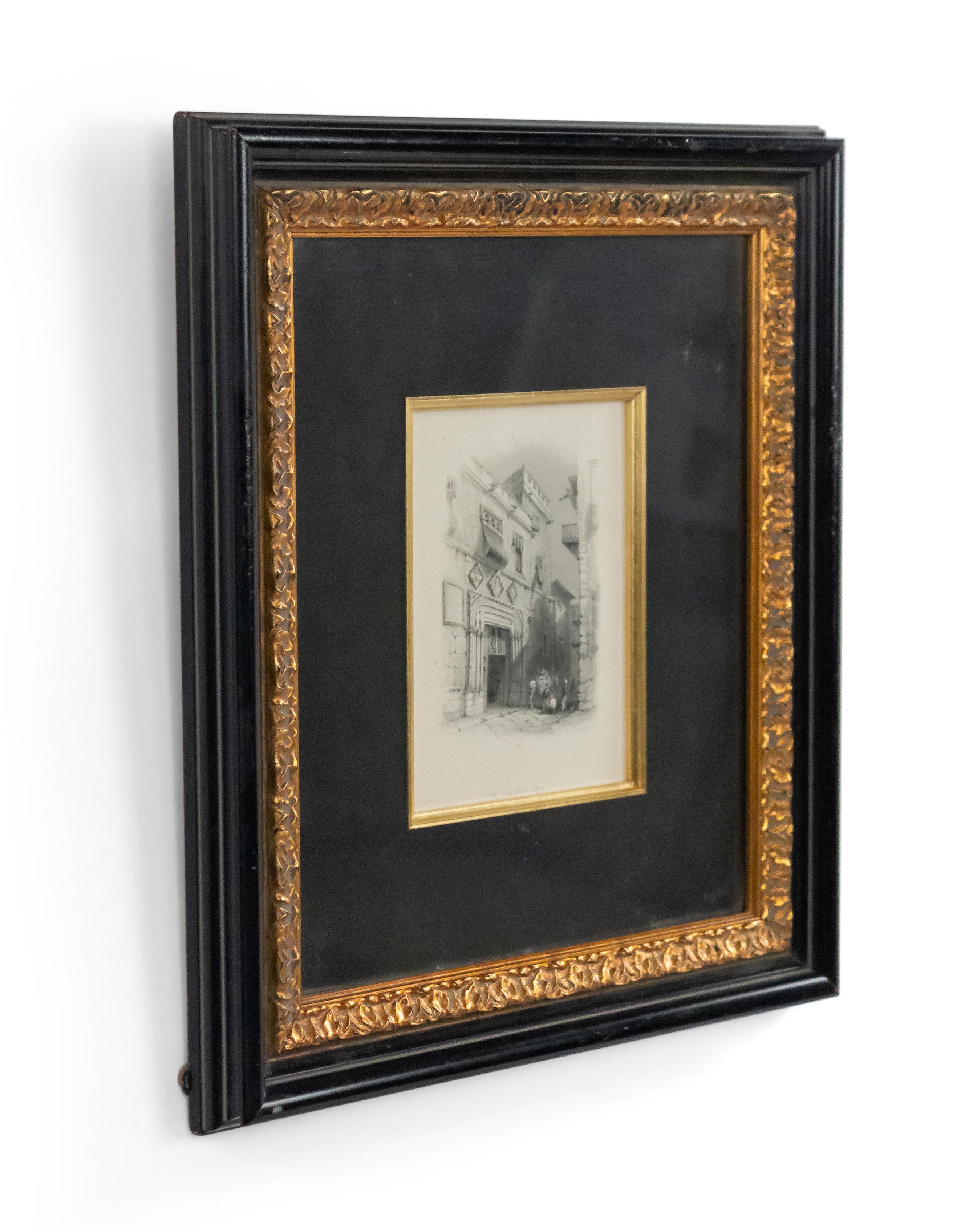 English Victorian steel plate engraving of a streetscape (19th-Century) in a black and gold decorative frame. Written on back of frame: (1856 // England). (Similar to MP22344)..
