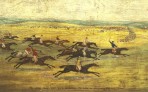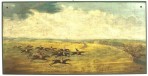 English Victorian style (20th Century) oil on board painting of a steeplechase scene with horses rounding a turn in front of a crowd of spectators.