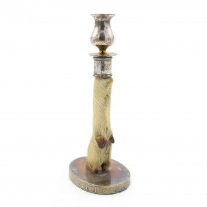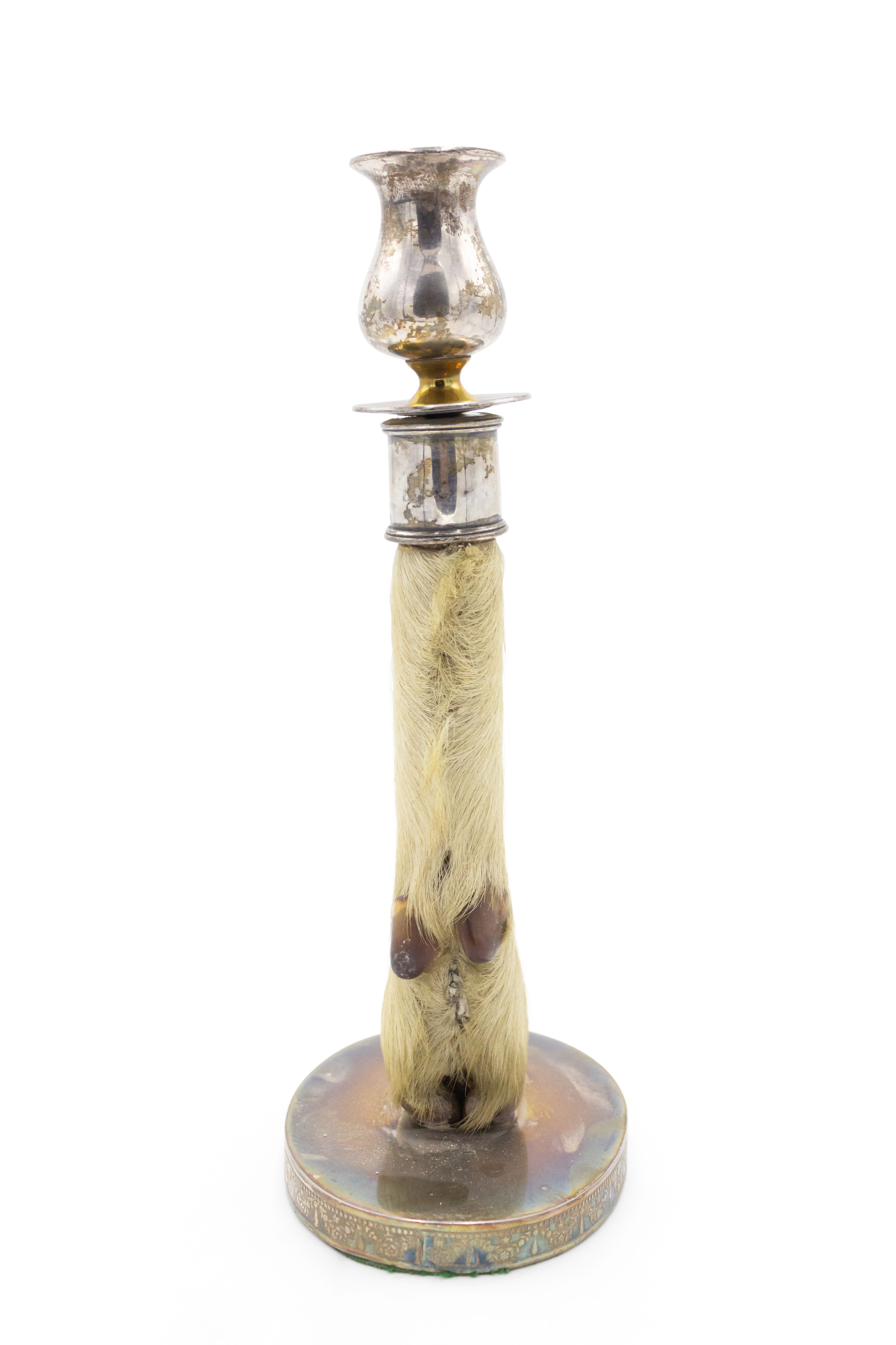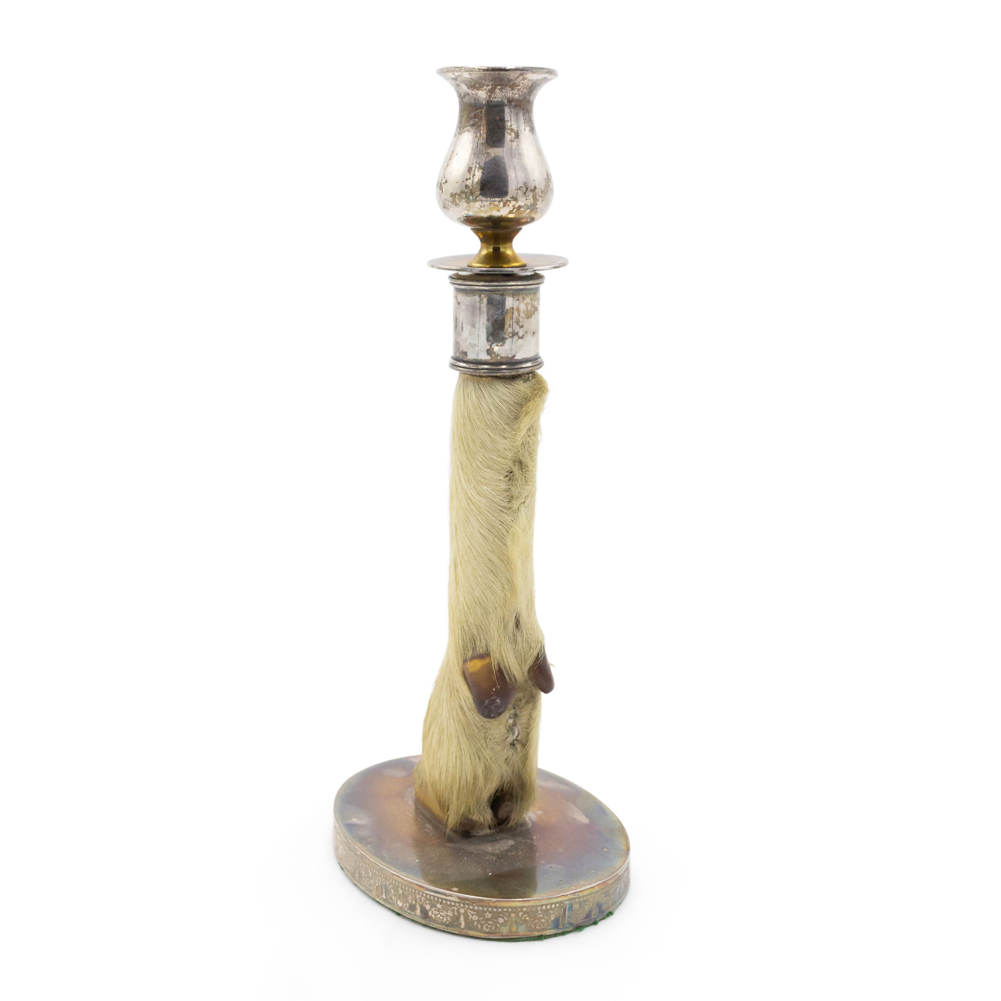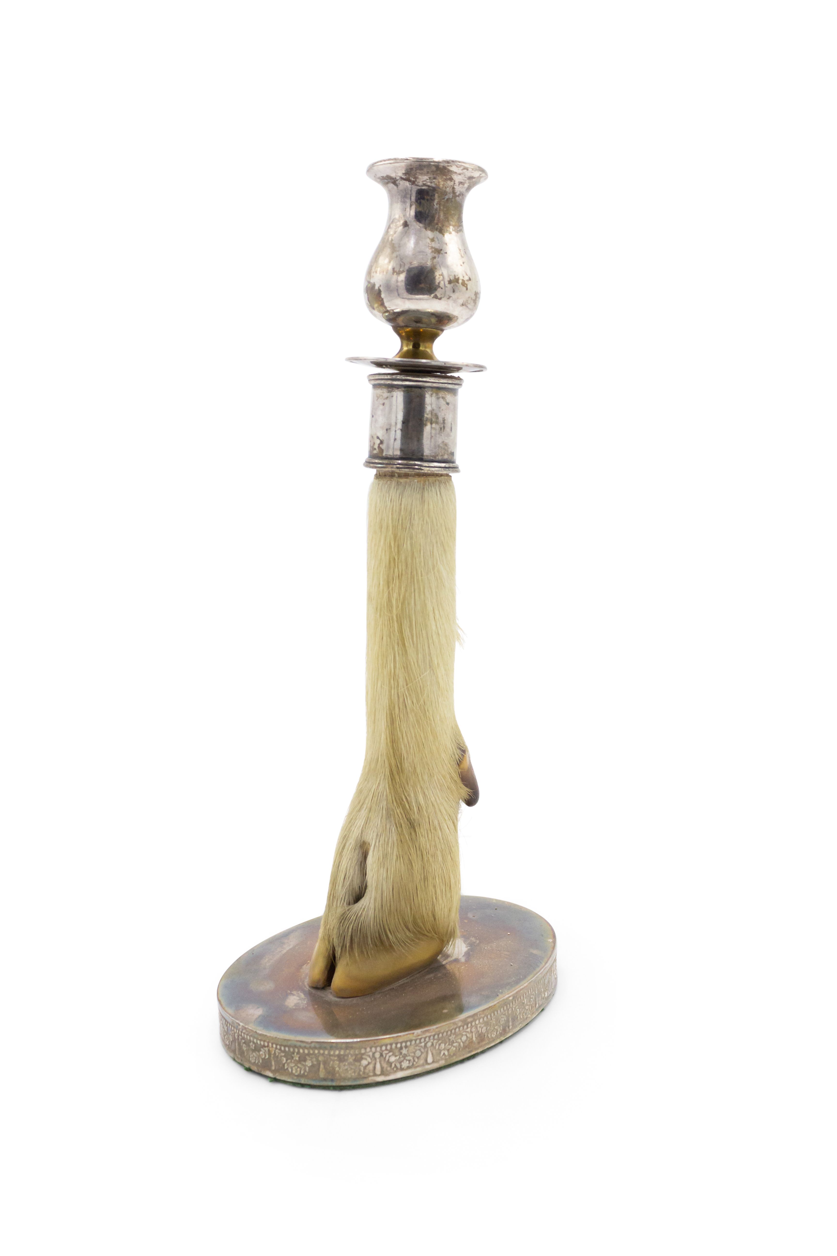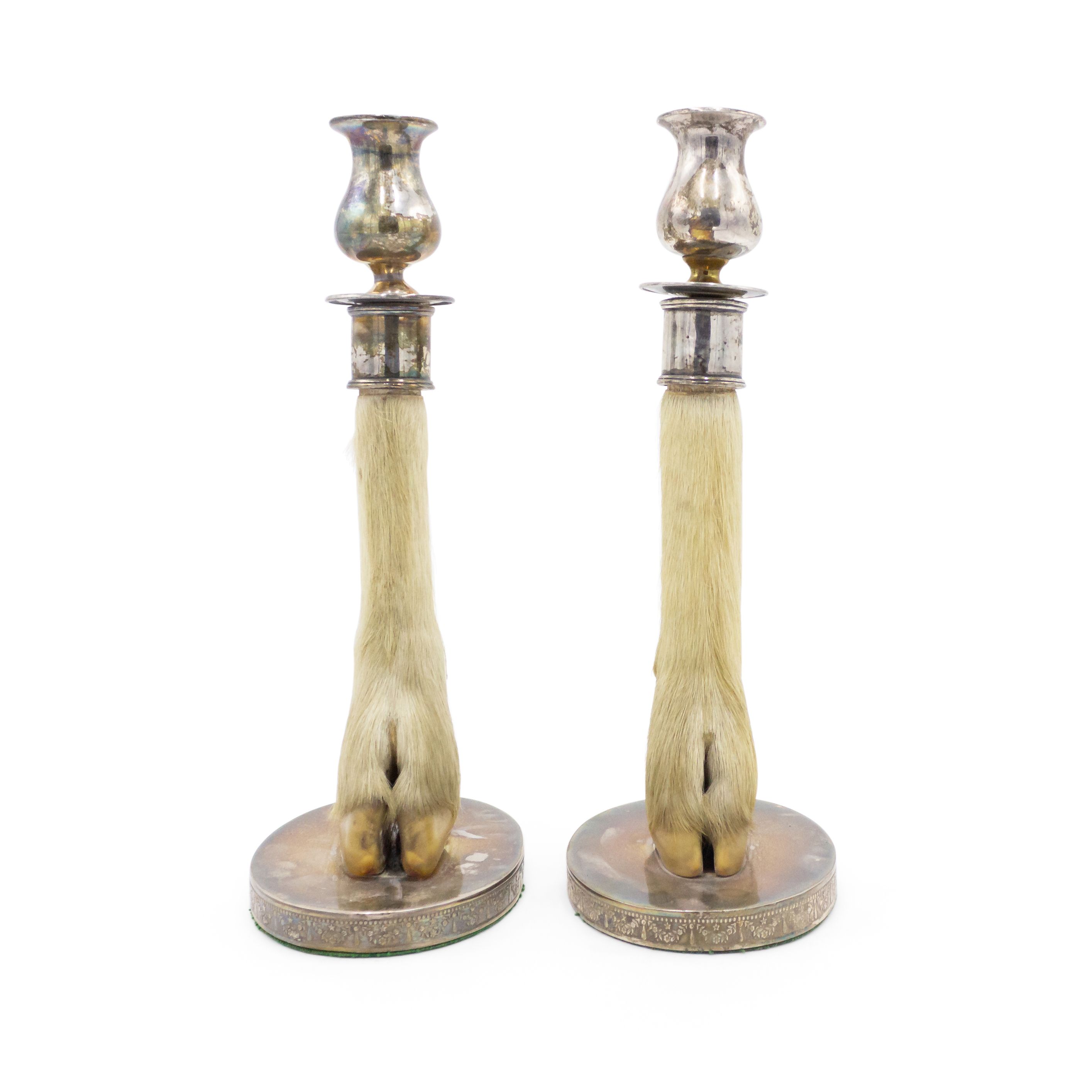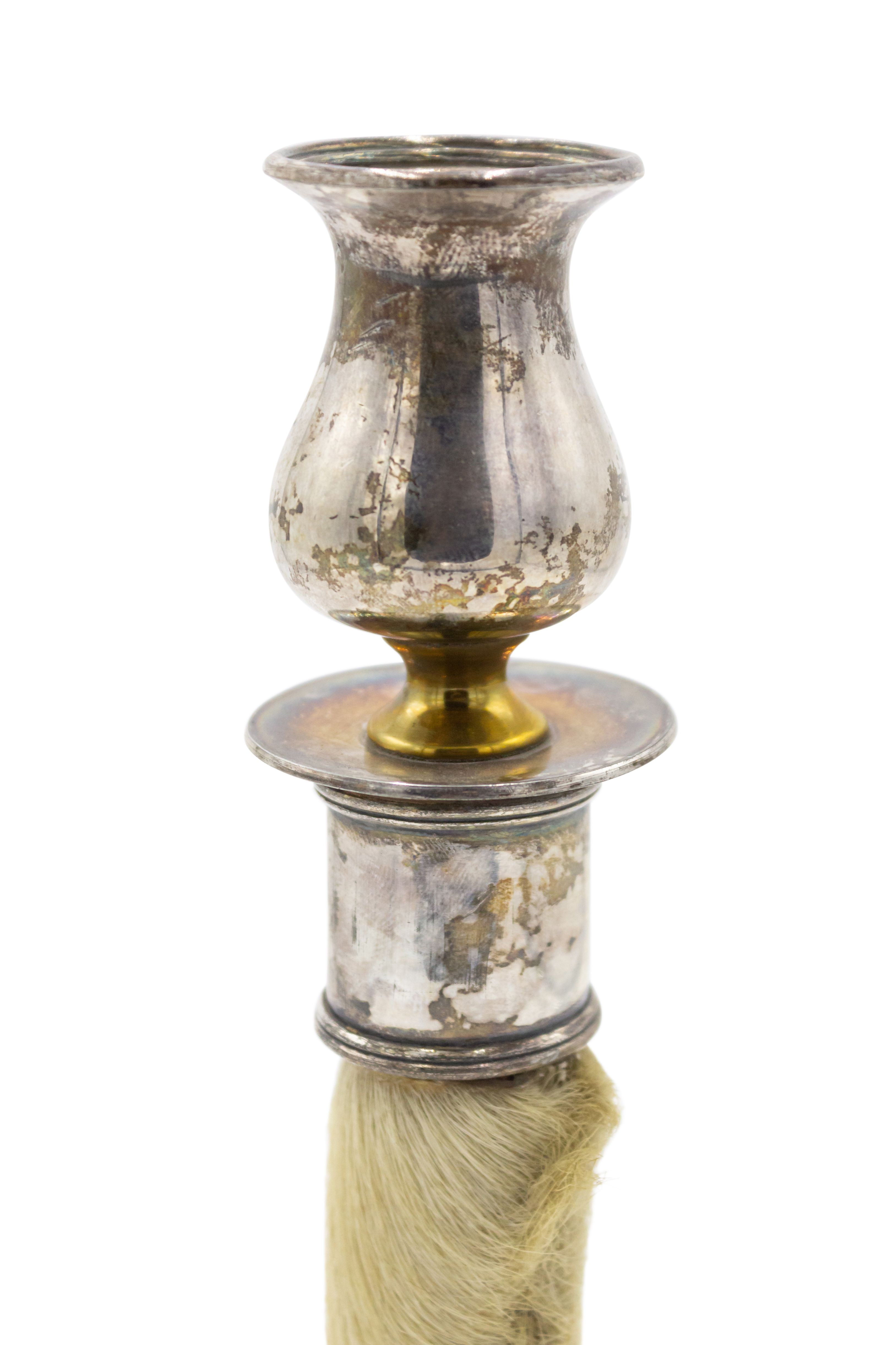 PAIR of English (19/20th Century) taxidermy deer hoof candlesticks with oval silver base and top (PRICED AS PAIR).