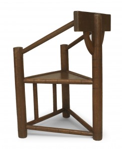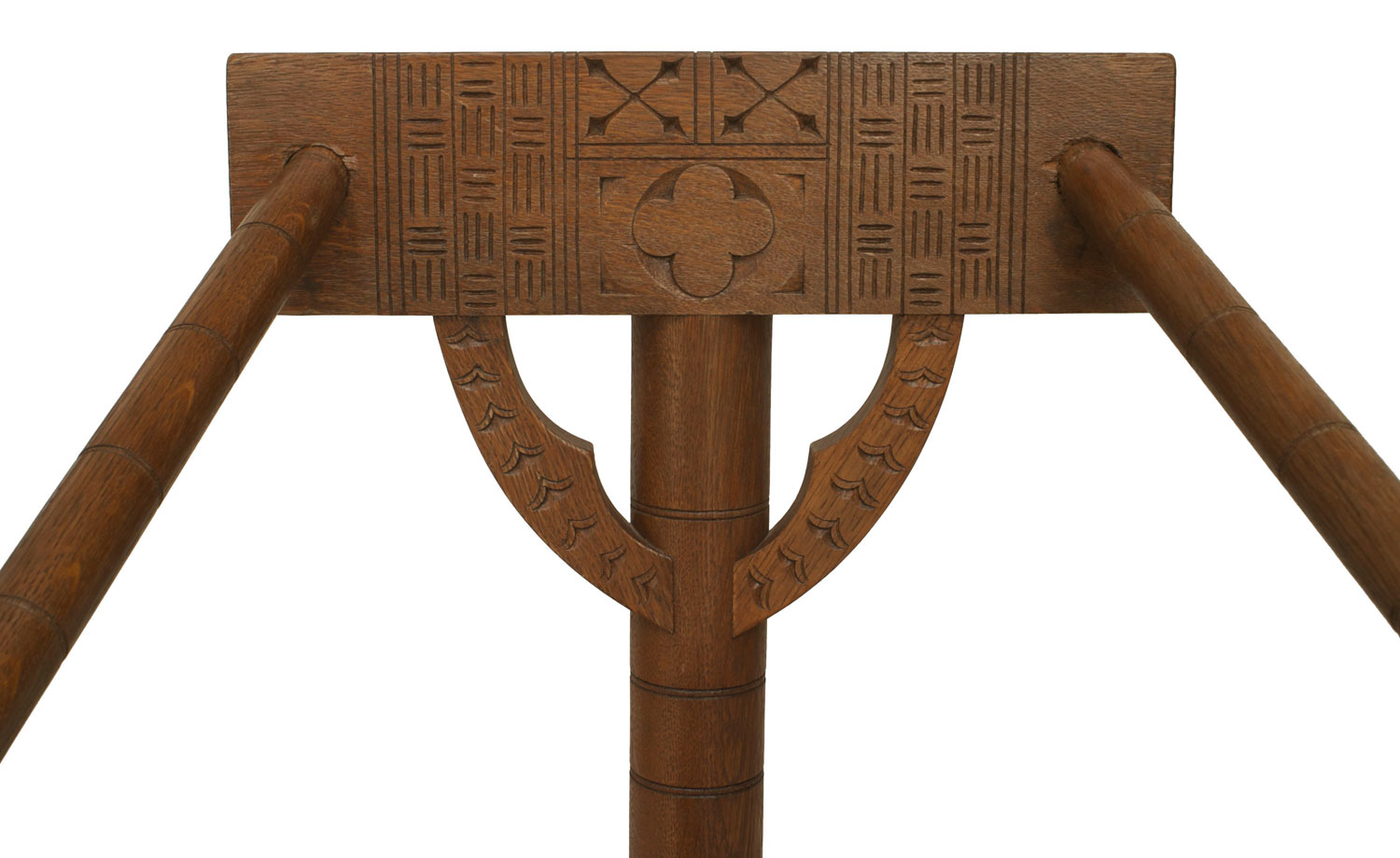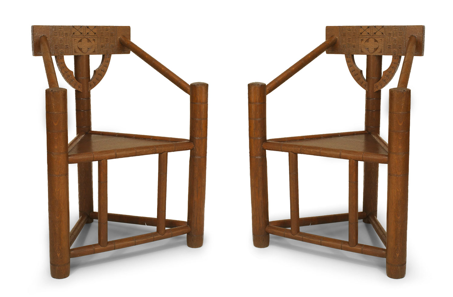 PAIR of English Aesthetic Movement "Oxford style" oak triangular shaped Armchairs with a carved design on back