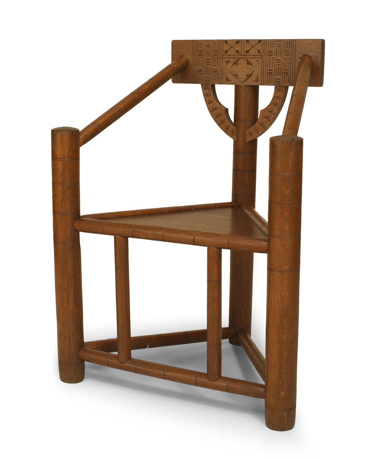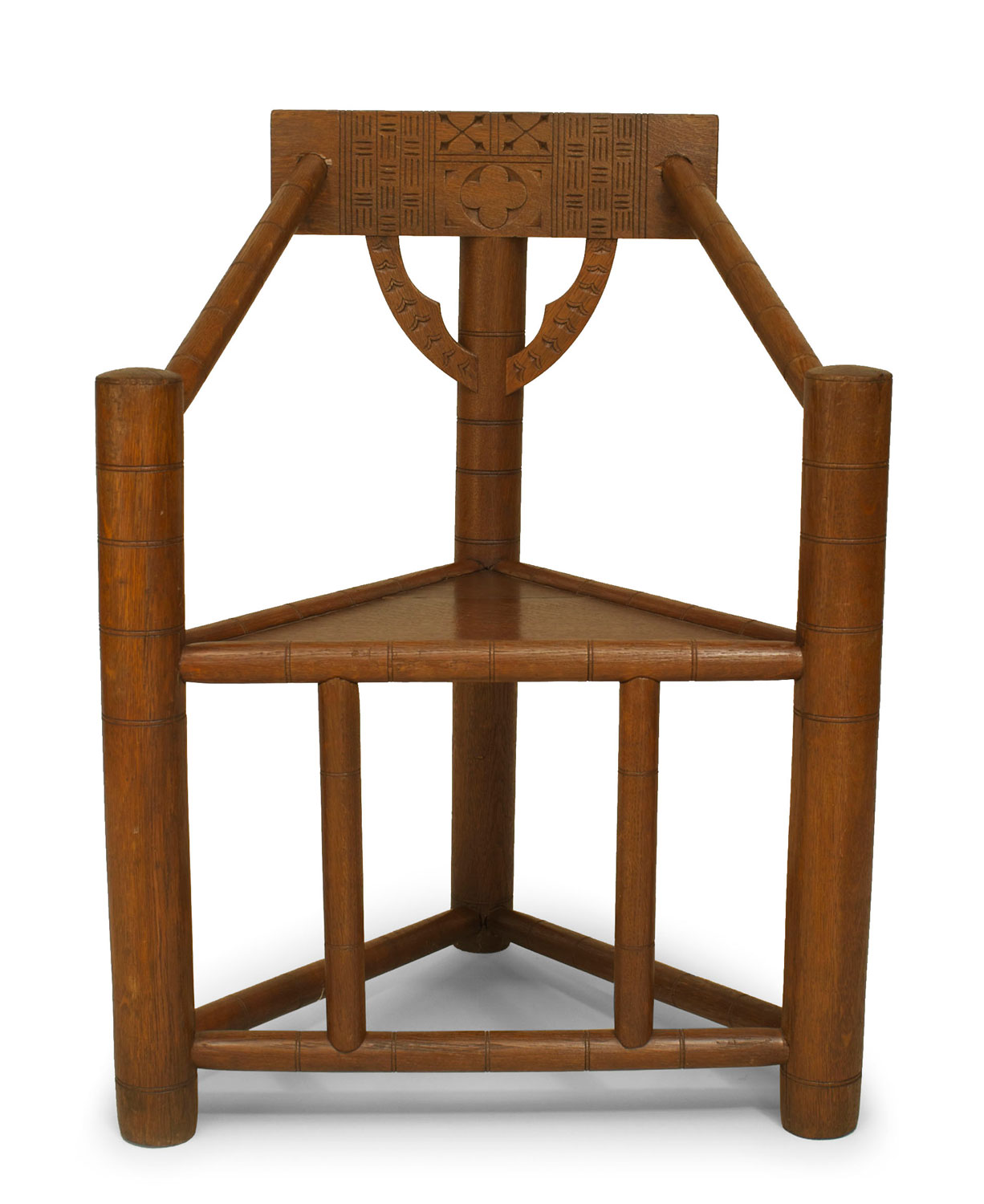 PAIR of English Aesthetic Movement "Oxford style" oak triangular shaped Armchairs with a carved design on back.