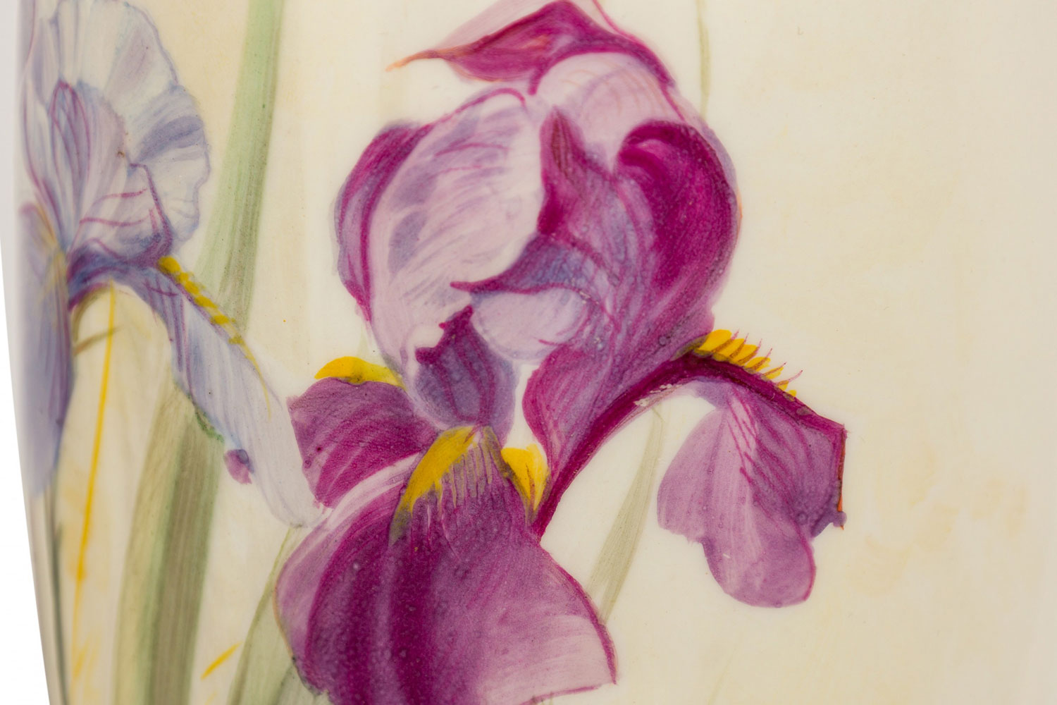 English Victorian style table lamp with a slender beige ceramic vase form body with a purple iris design on two sides, resting on a circular brass foot and mounted with brass hardware.