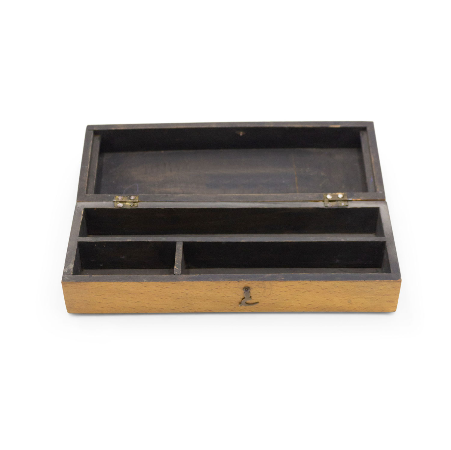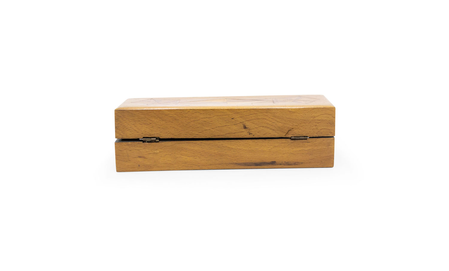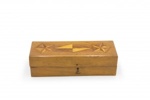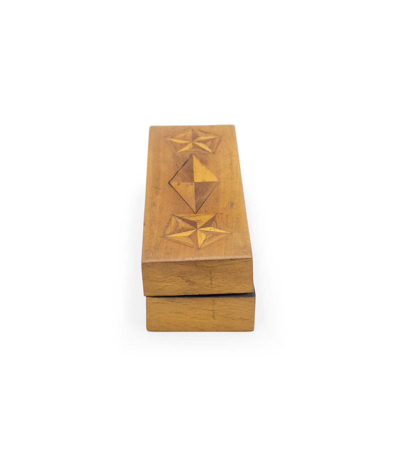 English Victorian-style rectangular light wood box with star and diamond shape inlays, with 3 compartments