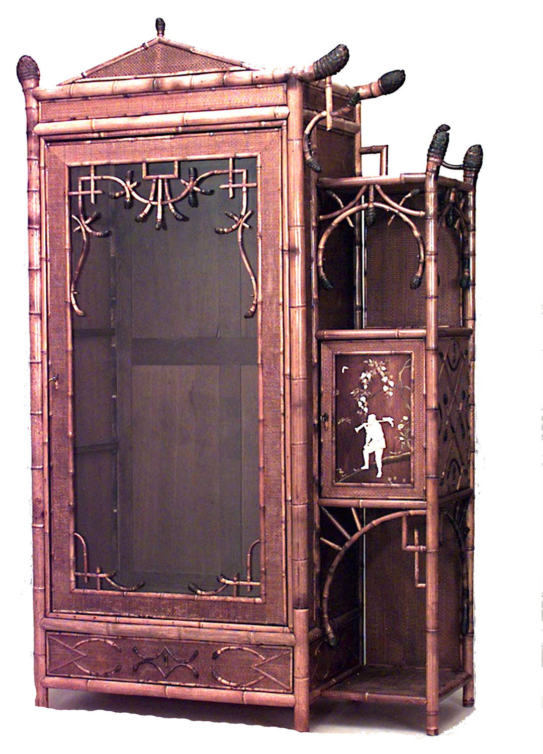 English Victorian Bamboo single glass door armoire cabinet with pediment top and rush veneer under bamboo trim with open side shelves and small rosewood door with bone figure..