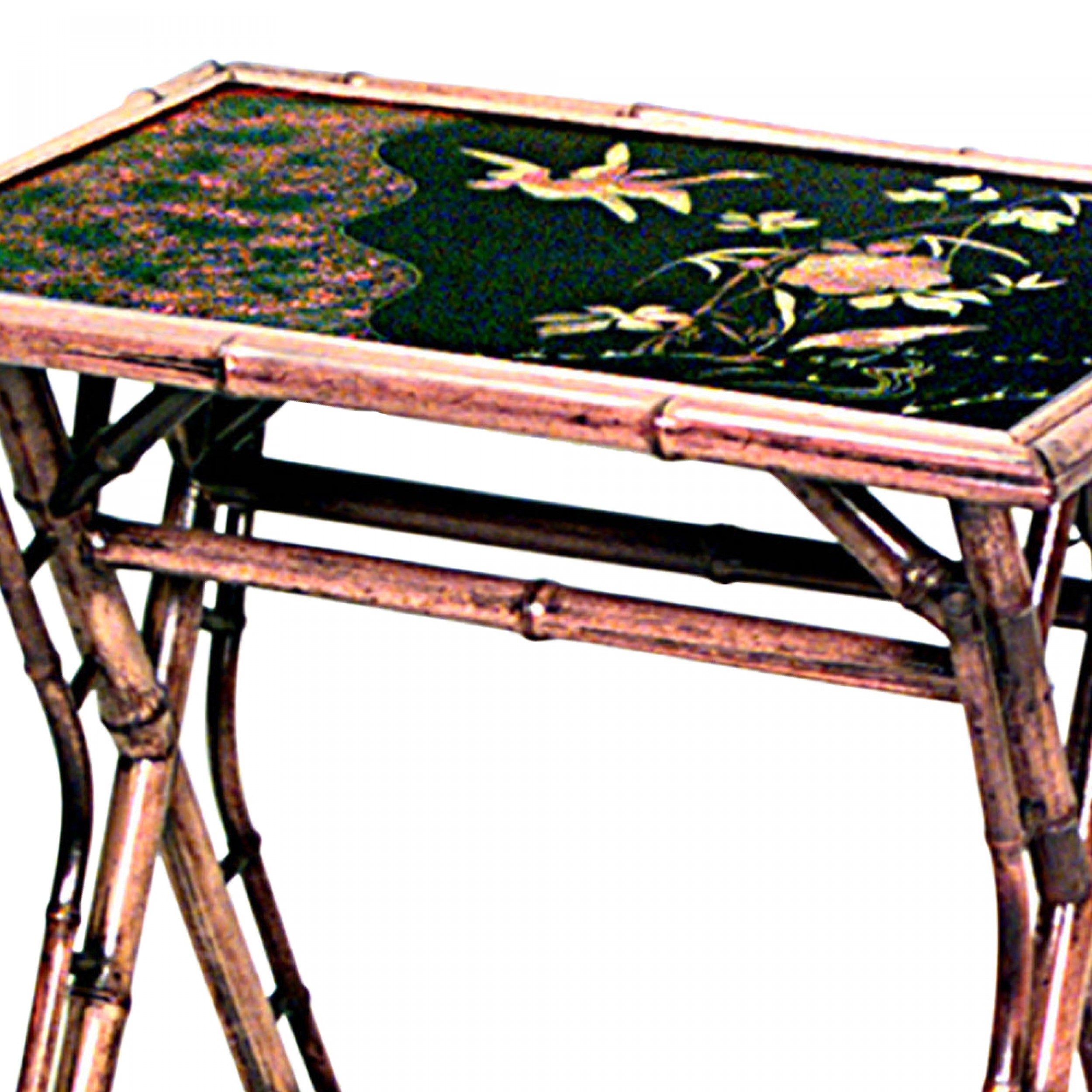 English Victorian-style (20th Century) Bamboo rectangular cross leg end table with lacquered top and shelf..
