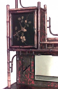 English Victorian Bamboo 3 door etagere with black lacquered Chinoiserie decorated panels and red & brown embossed brown paper trim.