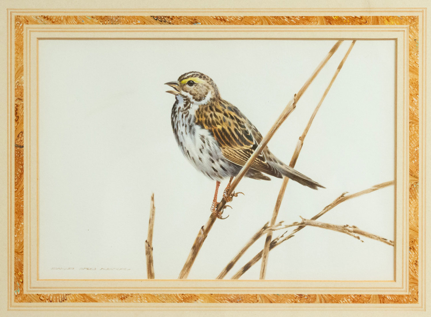 English Victorian maple and ebonized framed watercolor of a bird on a branch. (David Kerr) (Companion pieces: 053214D-I)