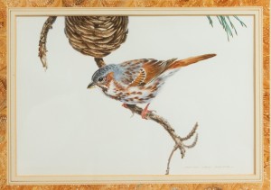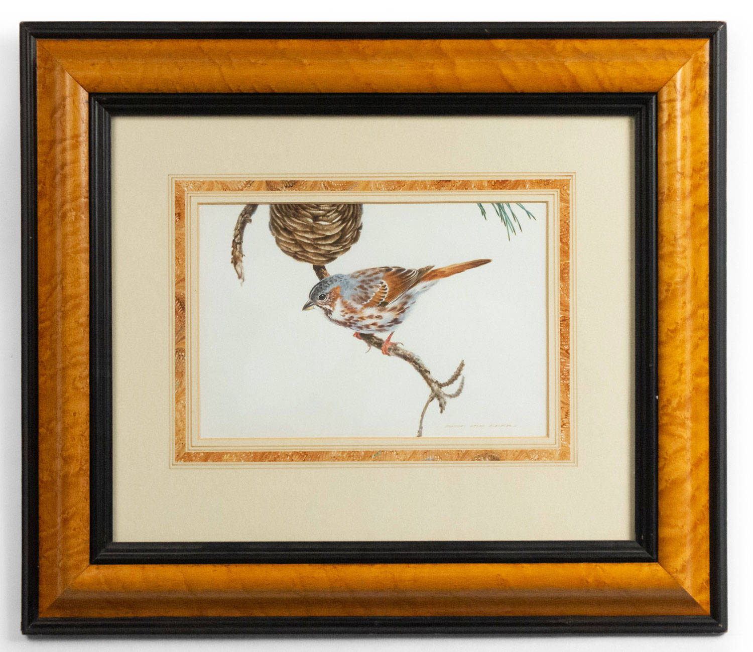 English Victorian maple and ebonized framed watercolor of a bird on a branch. (David Kerr)(Companion pieces: 053214C-I).