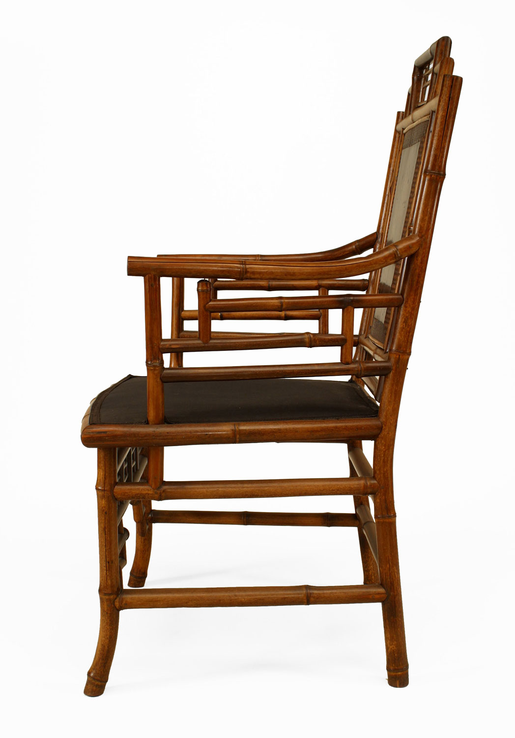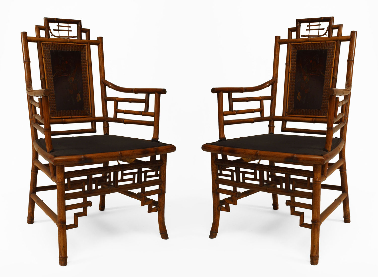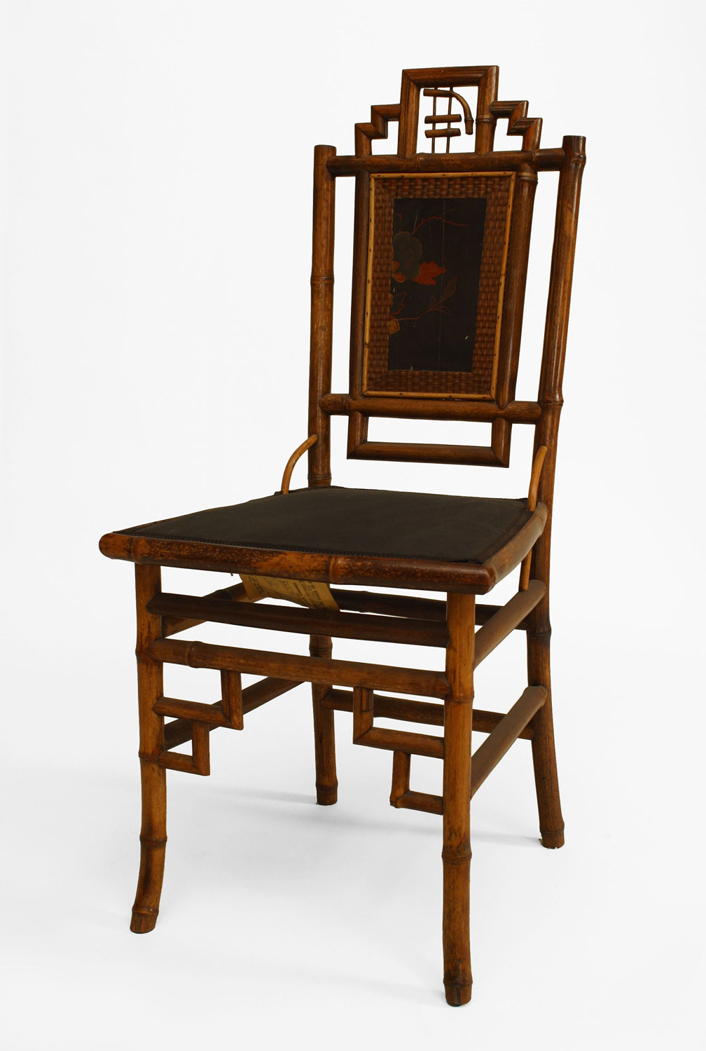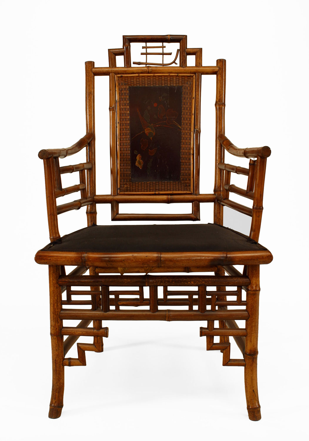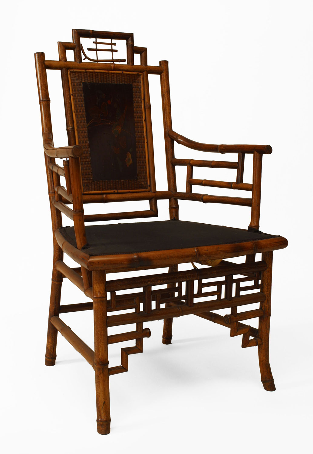 SET of 8 bamboo (English Victorian) chairs with black lacquered back panel and upholstered seat (2 arm chairs: 24½"w 25"d 42¼"h, 6 side chairs) (19th Cent.).