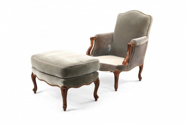 Style: English Materials & Techniques: Cloth, fabric, tufted, wood Category: Seating Condition: Missing caster on rear left leg. Good; Wear consistent with age and use