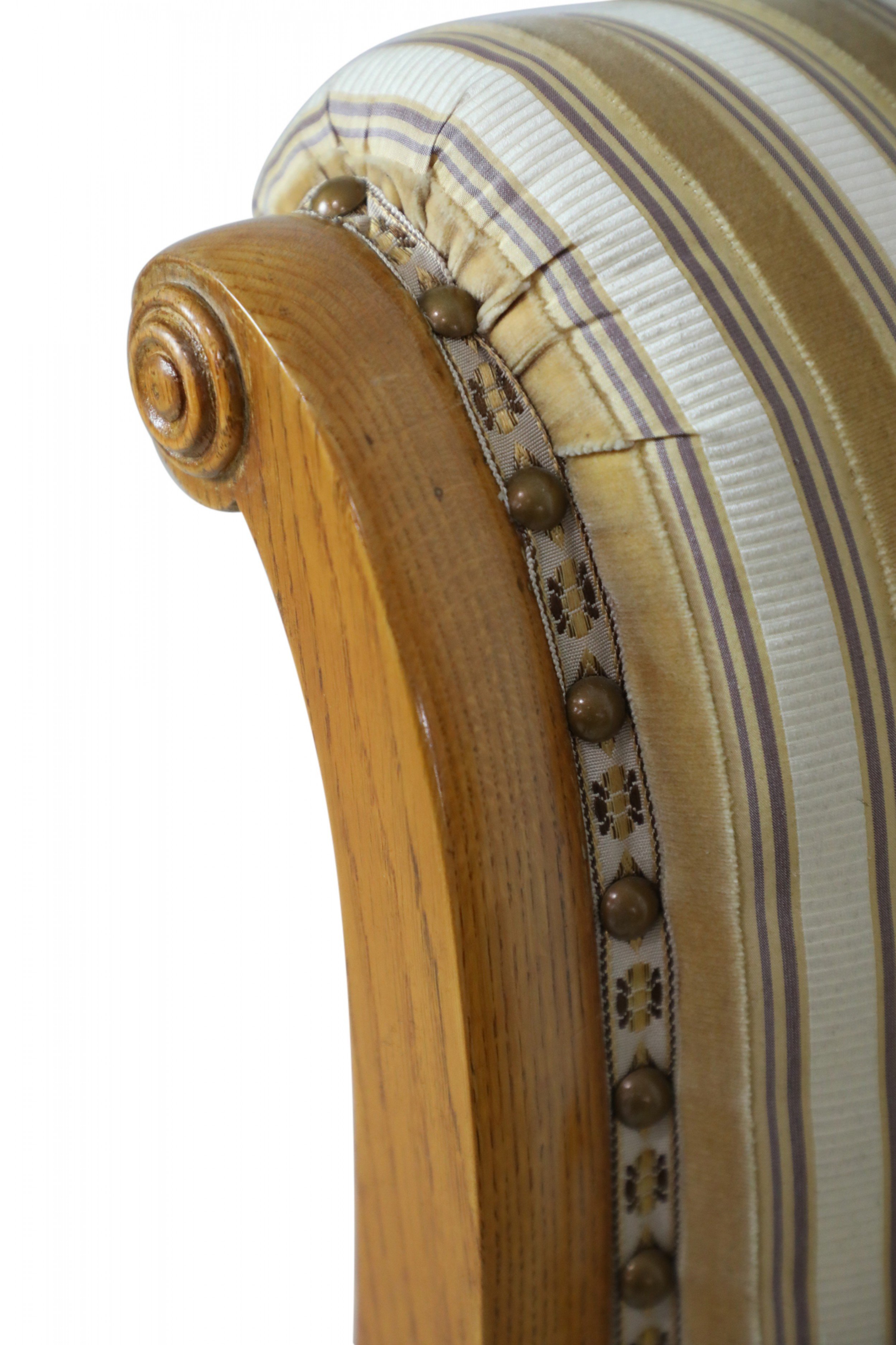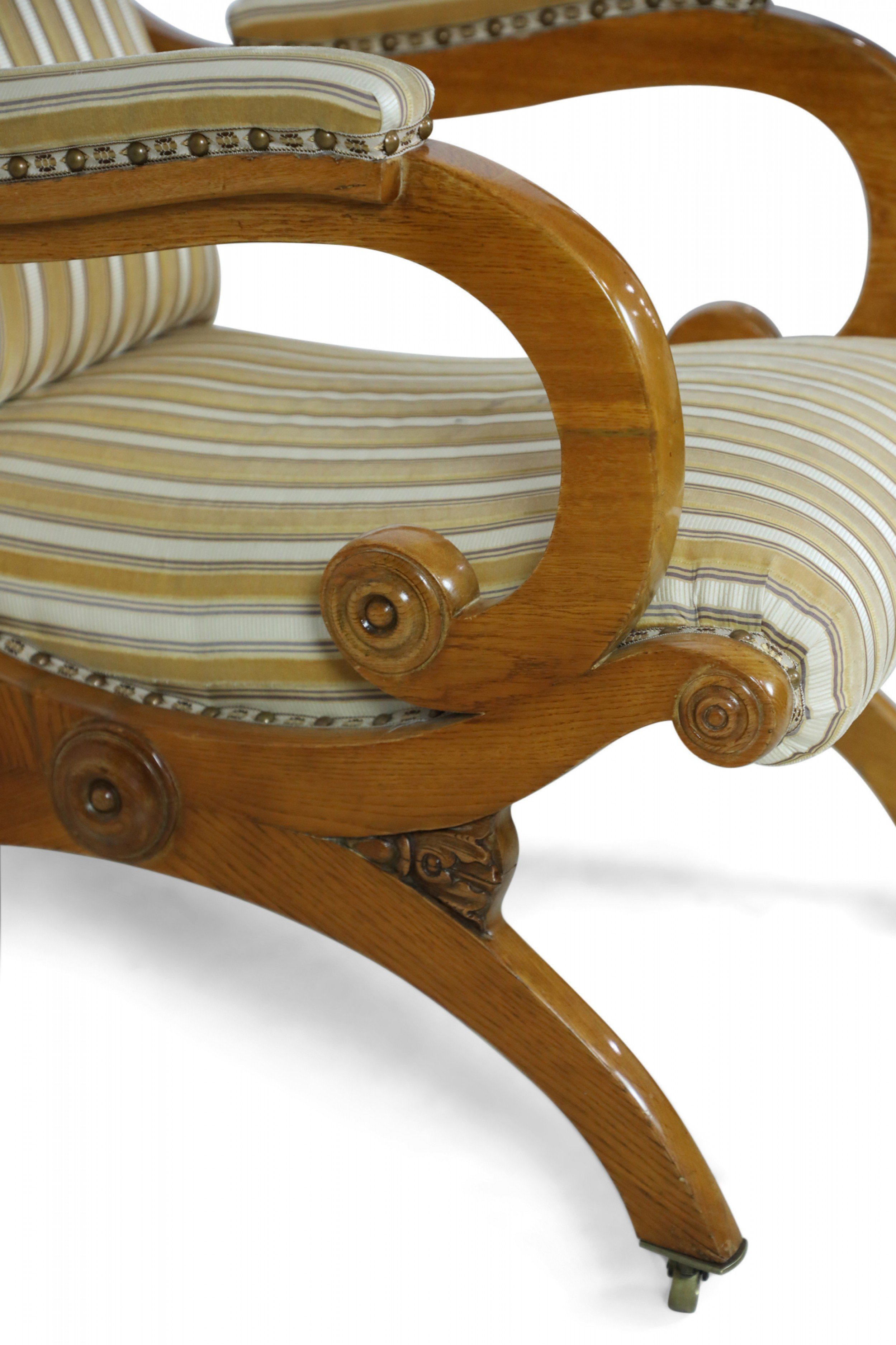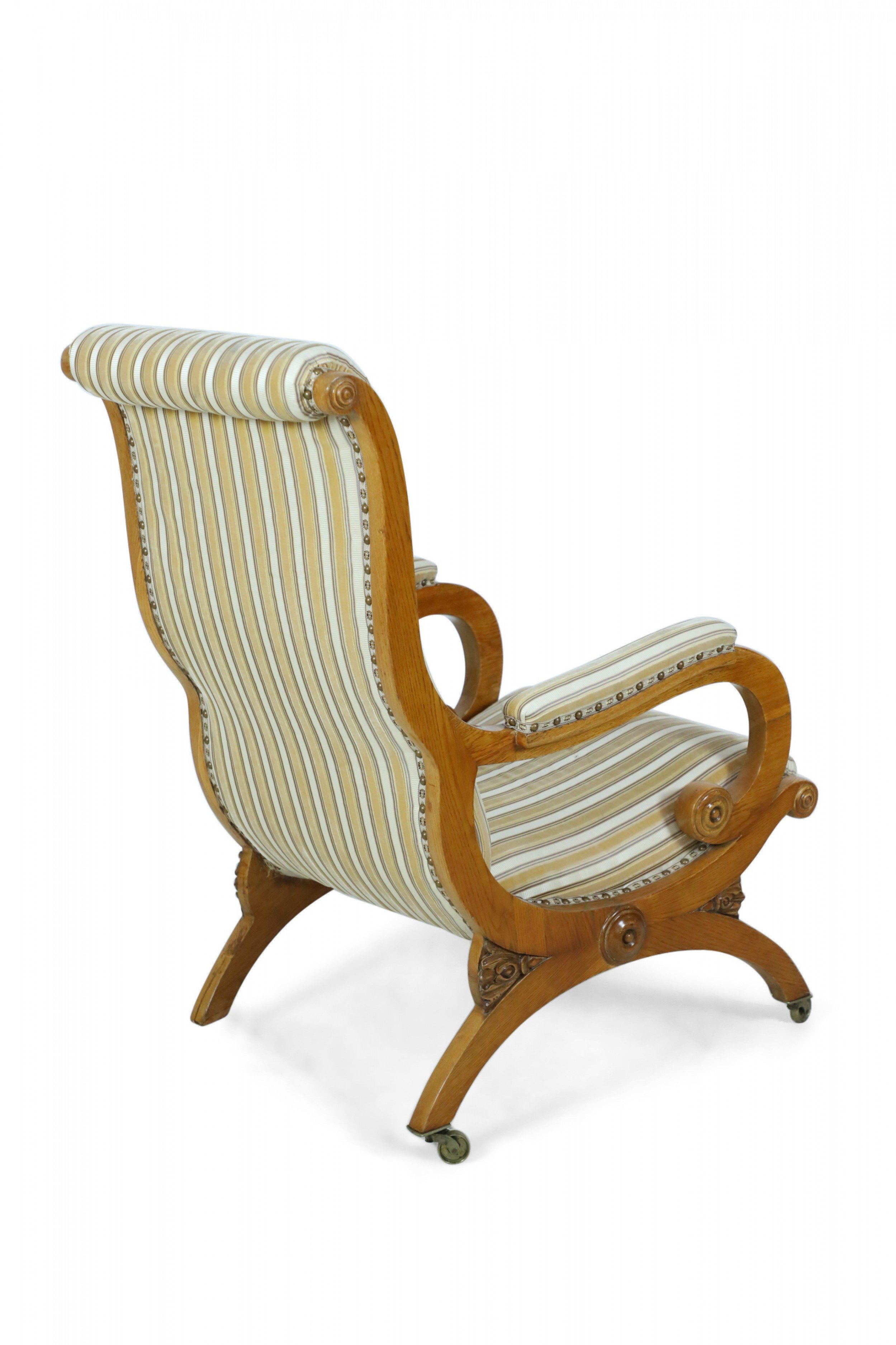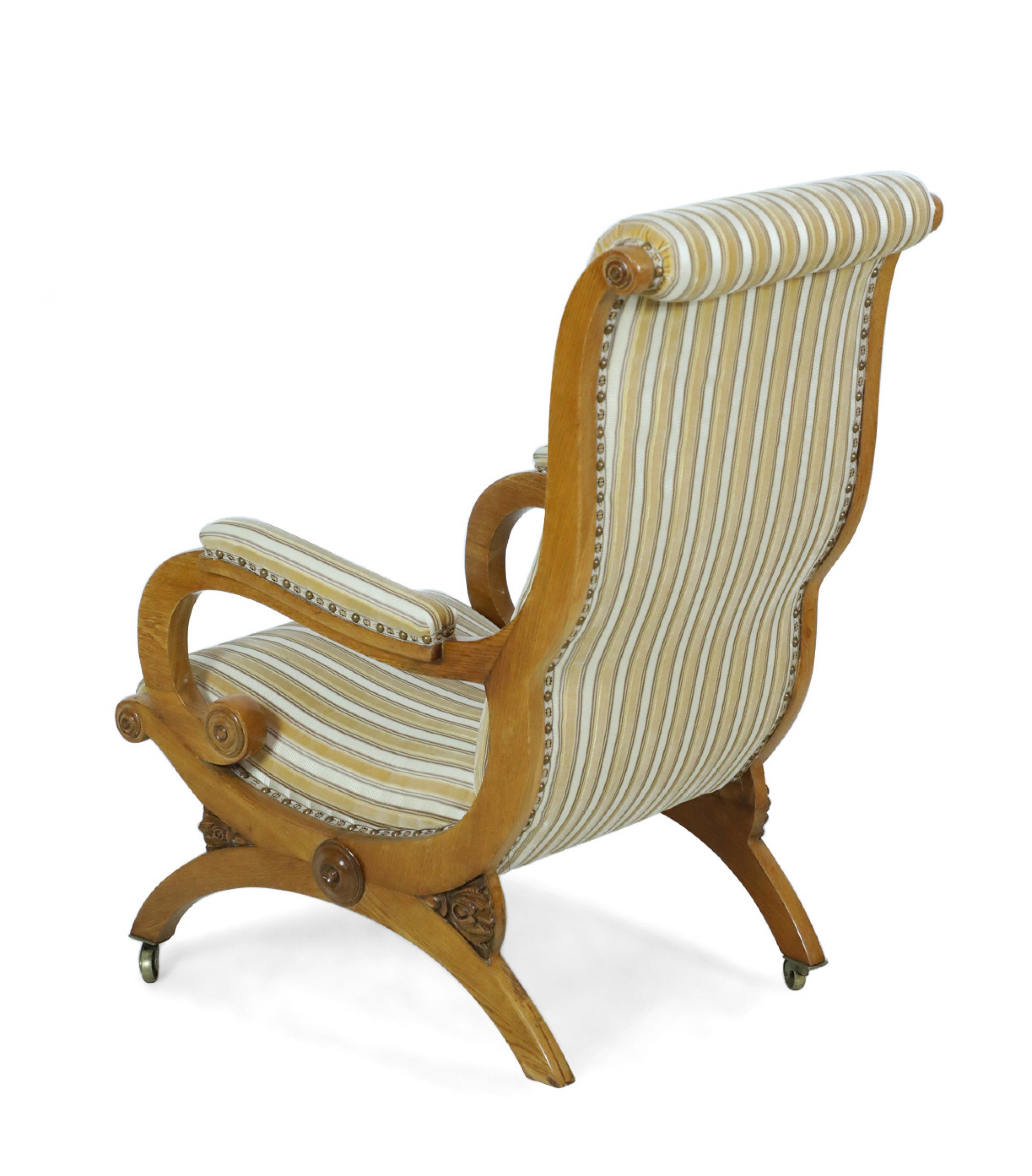 English Victorian Blond Wood Scroll Armchair with Striped Upholstery