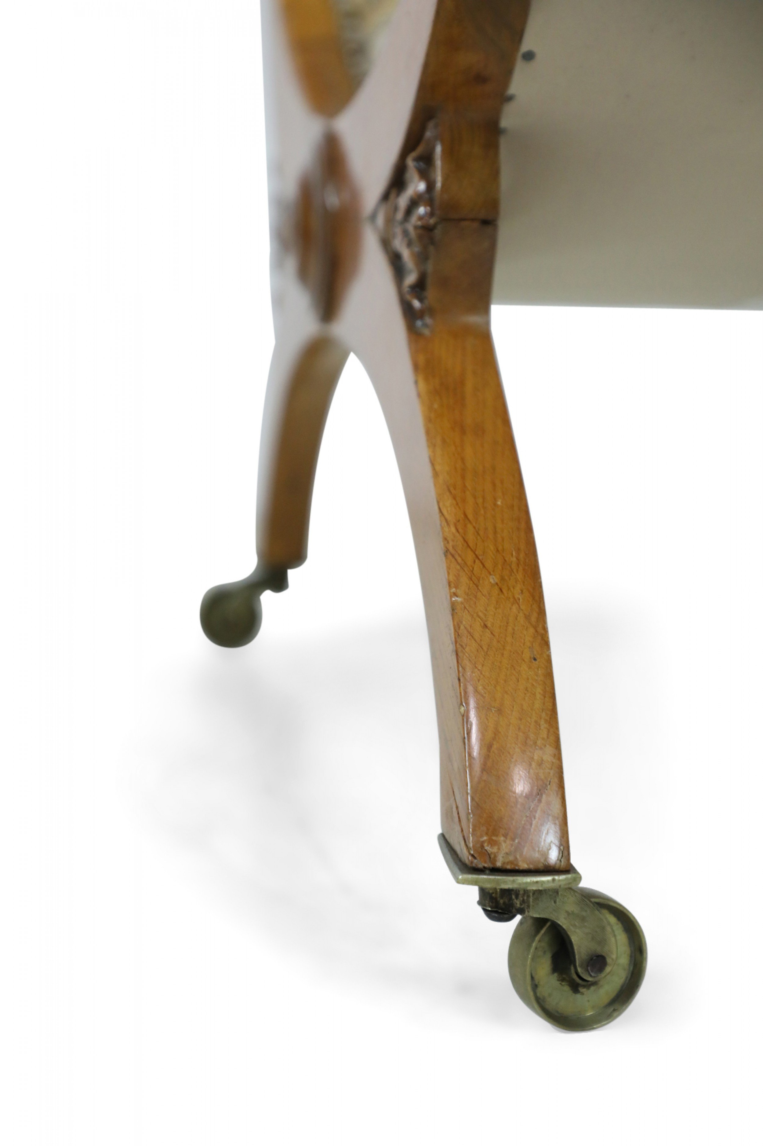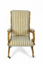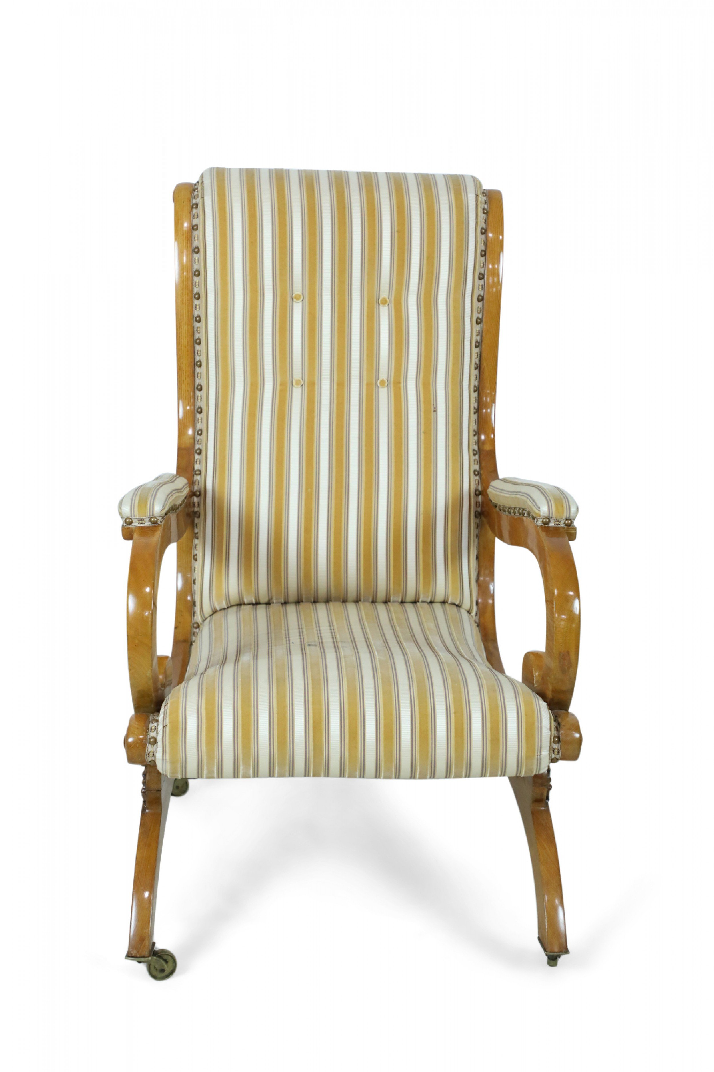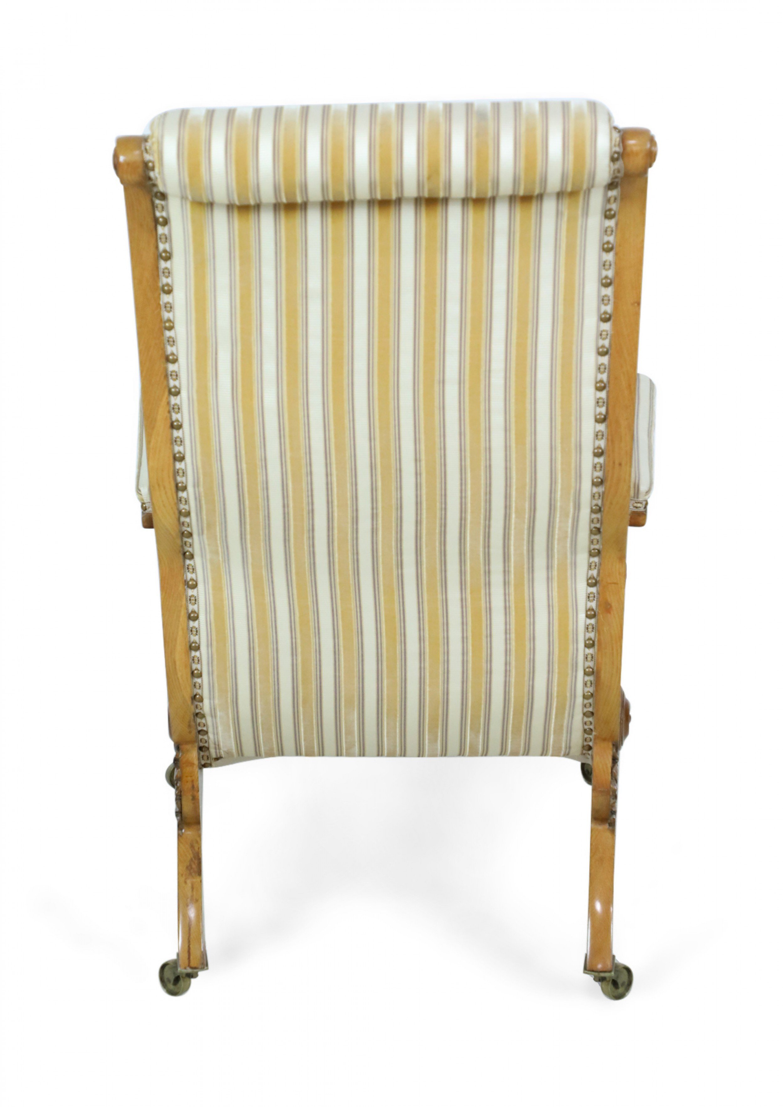 English Victorian blond wood scroll high back armchair with beige and brown striped button-tufted upholstery, brass nail head trim, carved medallions and designs in the frame with legs ending in brass casters..