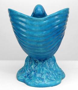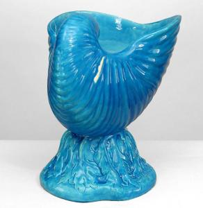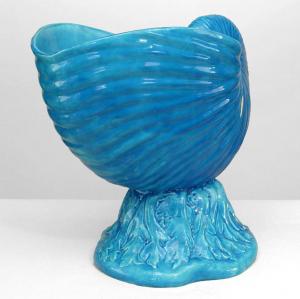 English Victorian large blue Majolica porcelain jardiniere of nautilus shell shape raised on a leafy form pedestal base (signed MINTON, 1873).