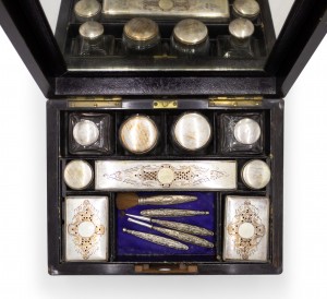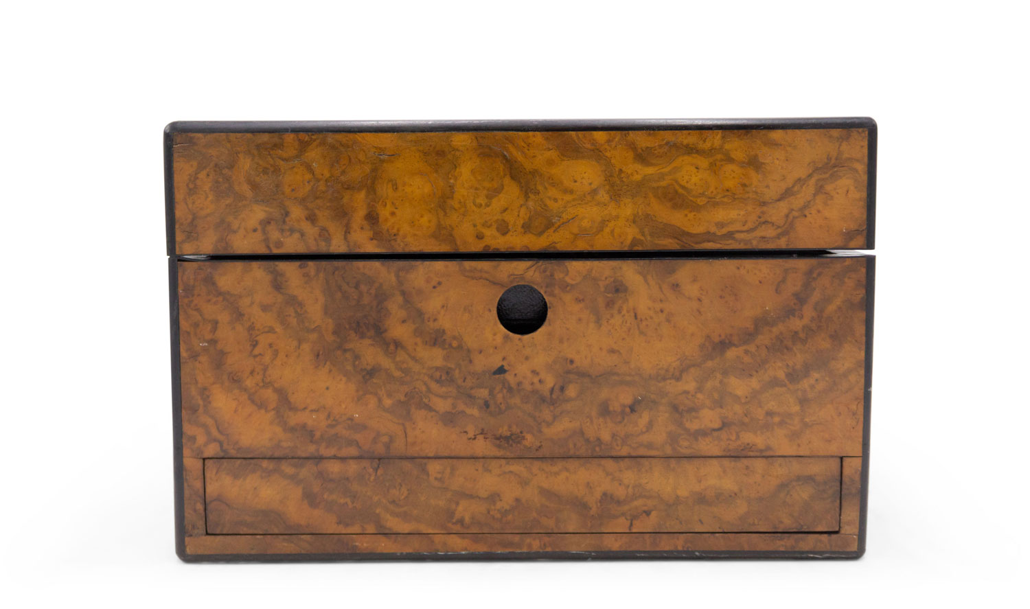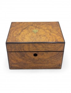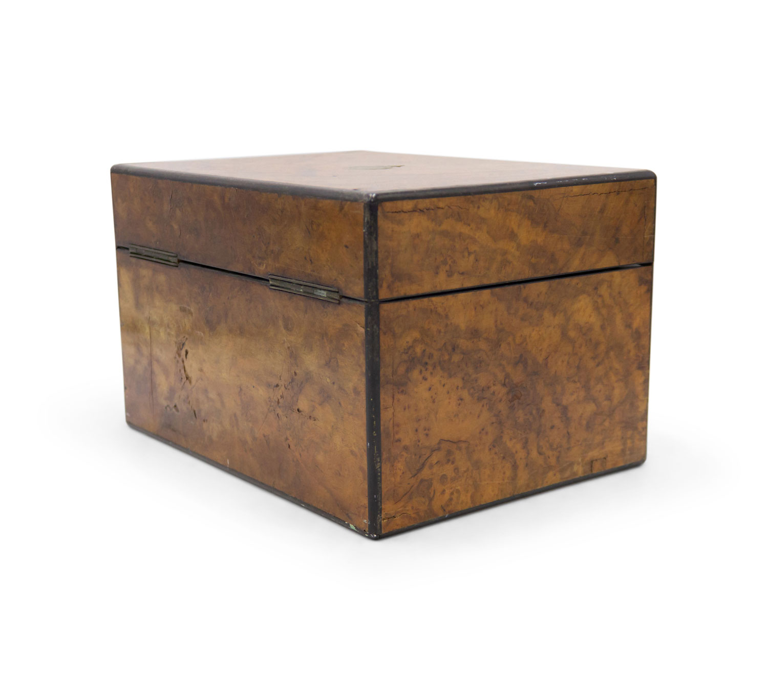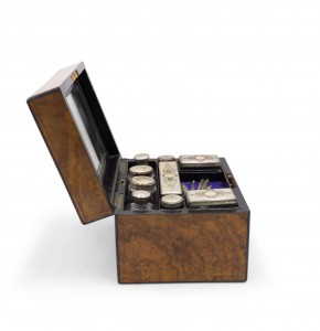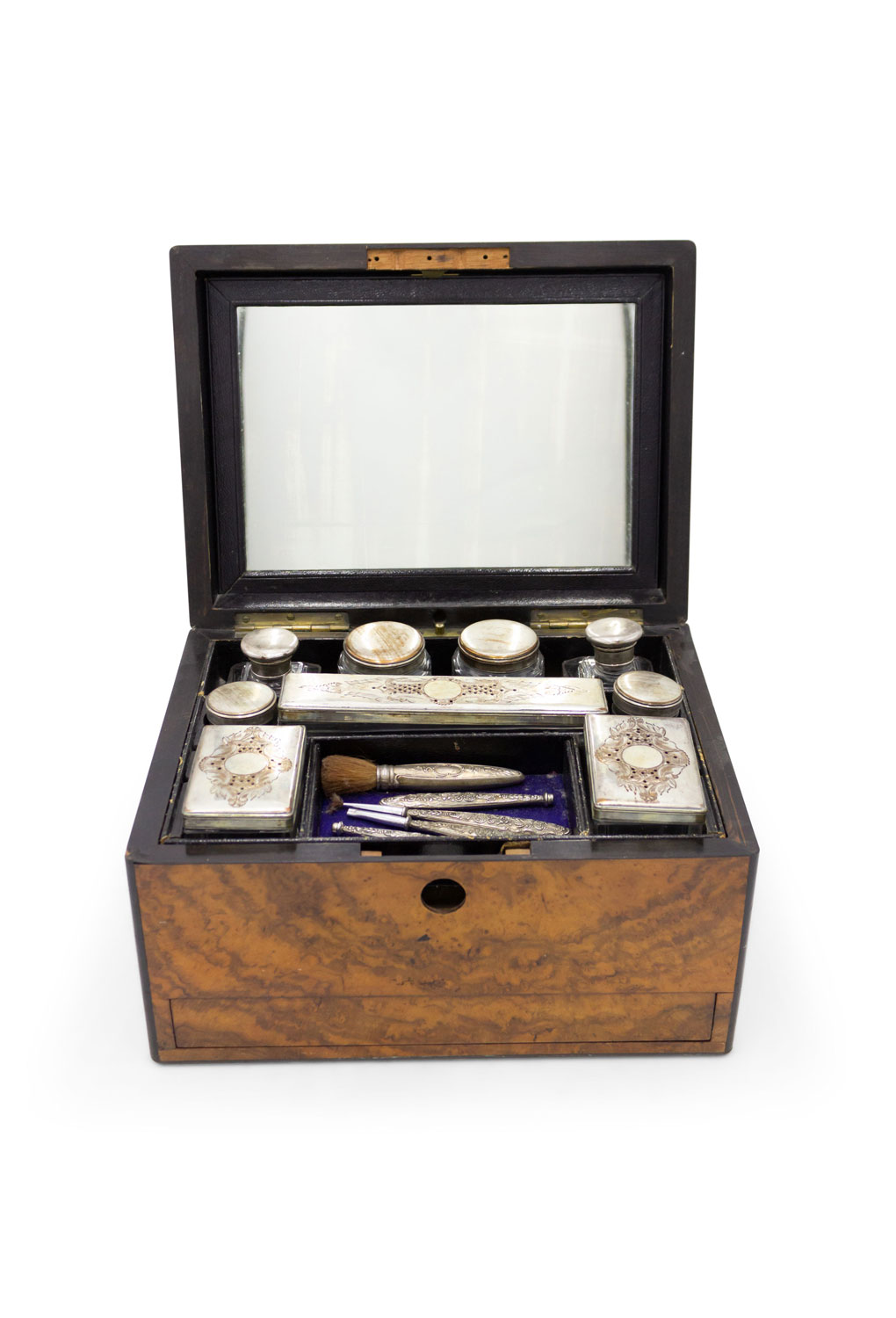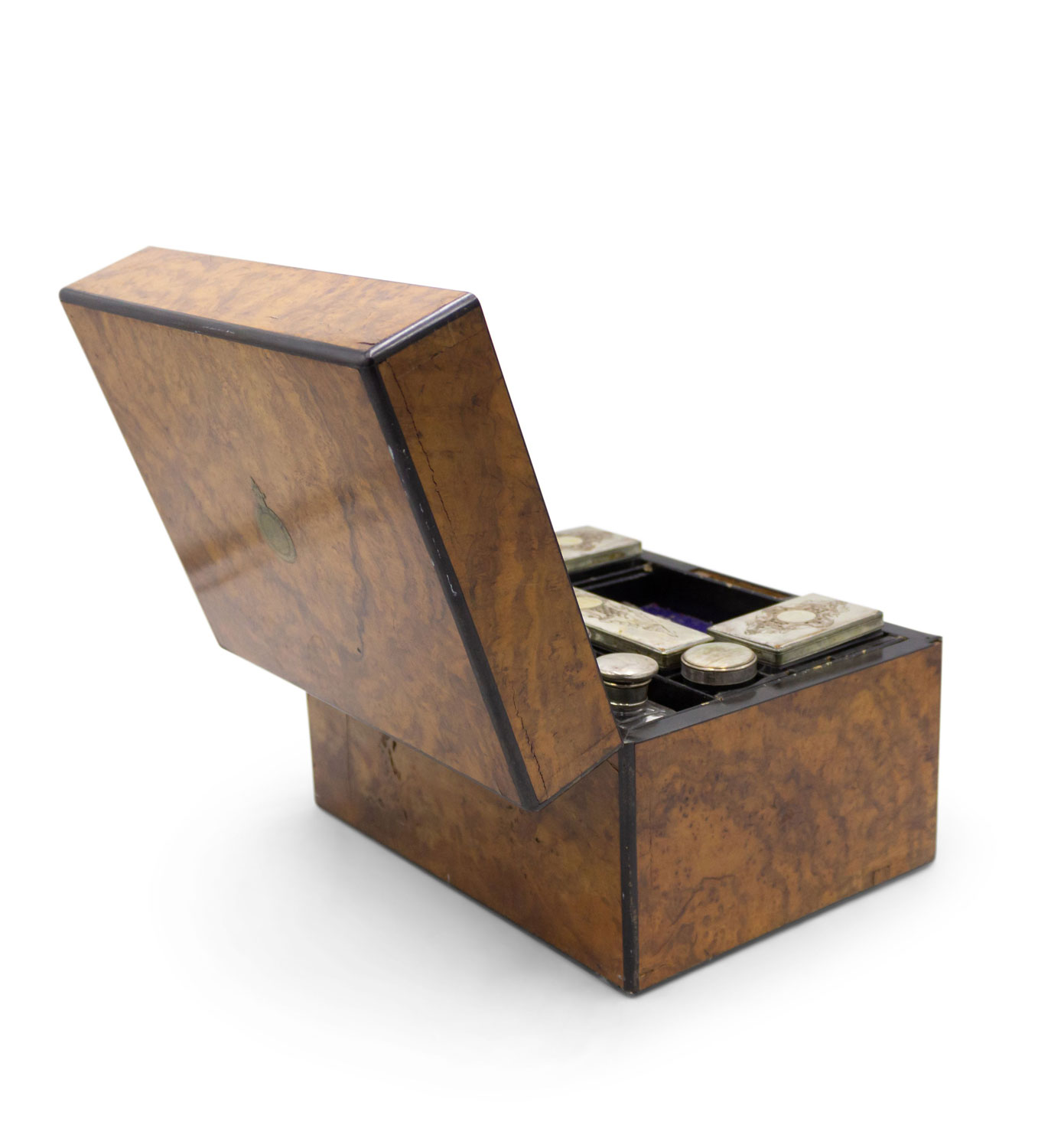 English Victorian burl wood traveling vanity / make up box with ebonized trim edge and a small lower drawer; interior holding 9 various silver boxes and 7 assorted implements.