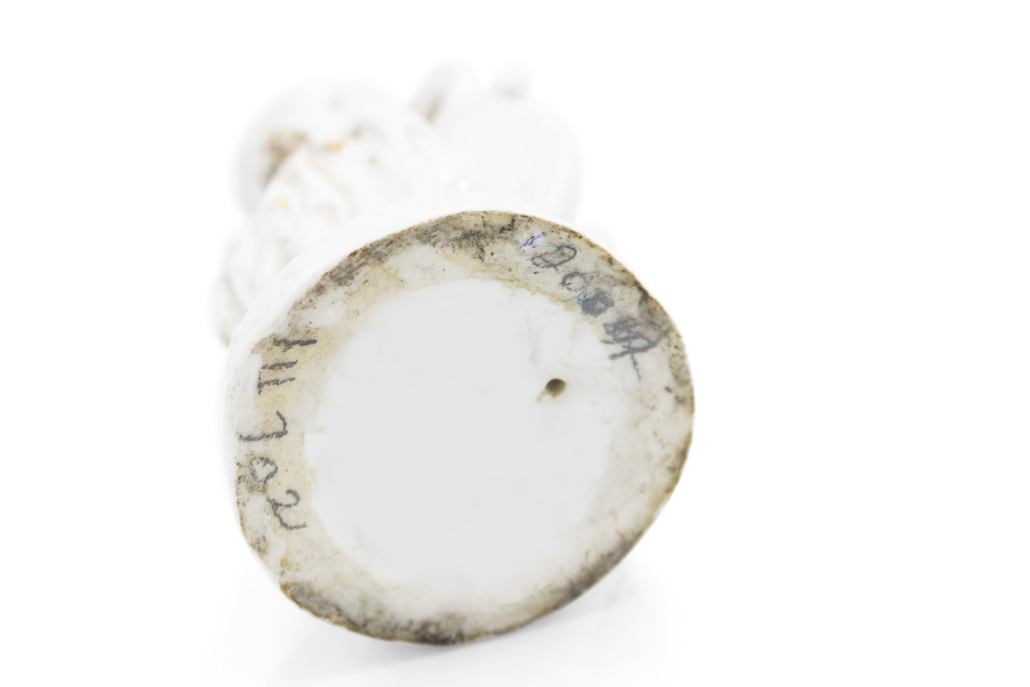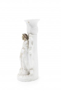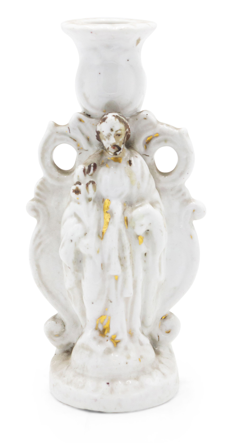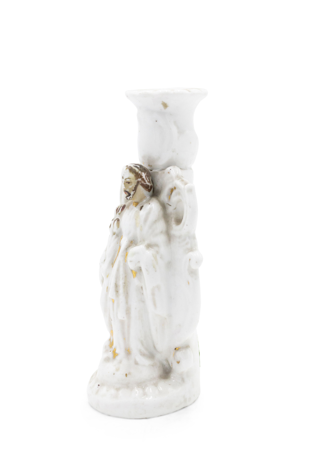English Victorian Chelsea porcelain candlestick with religious figure.