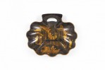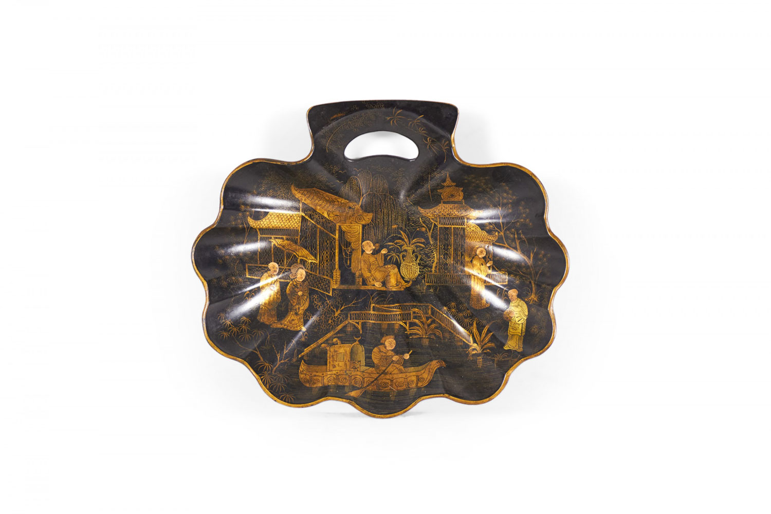English Victorian black lacquered and Chinoiserie decorated scalloped butlers tray and brush with handle..