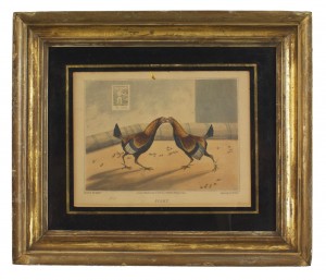 Set of 4 English Victorian gilt framed colored lithographs of cock fight scenes (Alken).