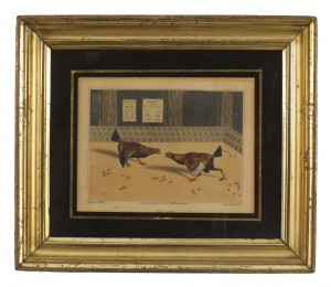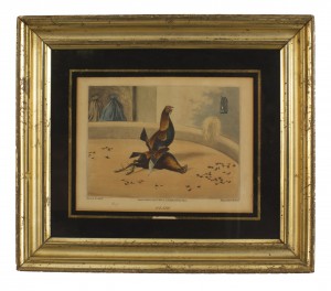 Set of 4 English Victorian gilt framed colored lithographs of cock fight scenes (Alken)