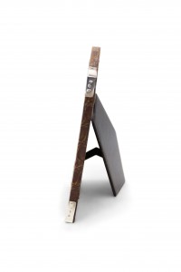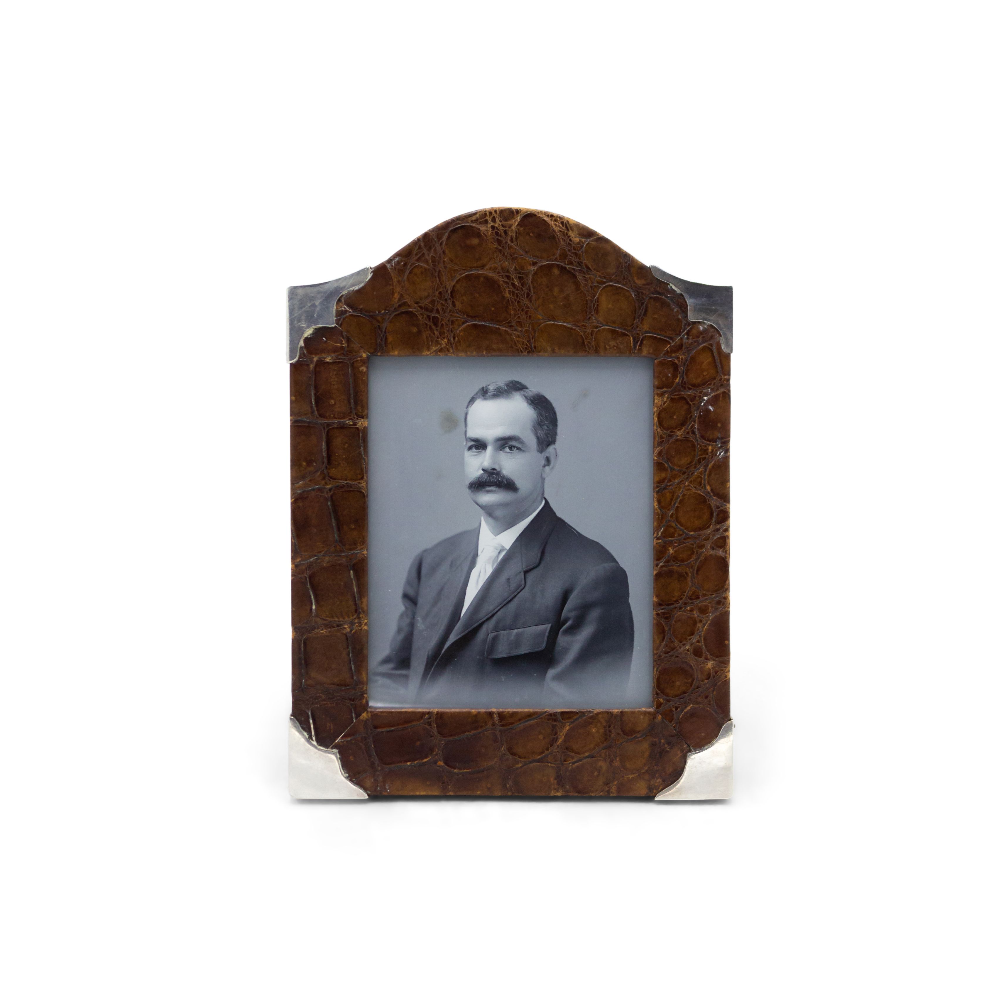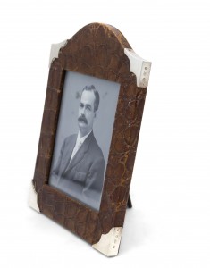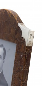 English Victorian-style (20th Century) brown crocodile easel picture frame with shaped top and 4 silver corners..