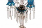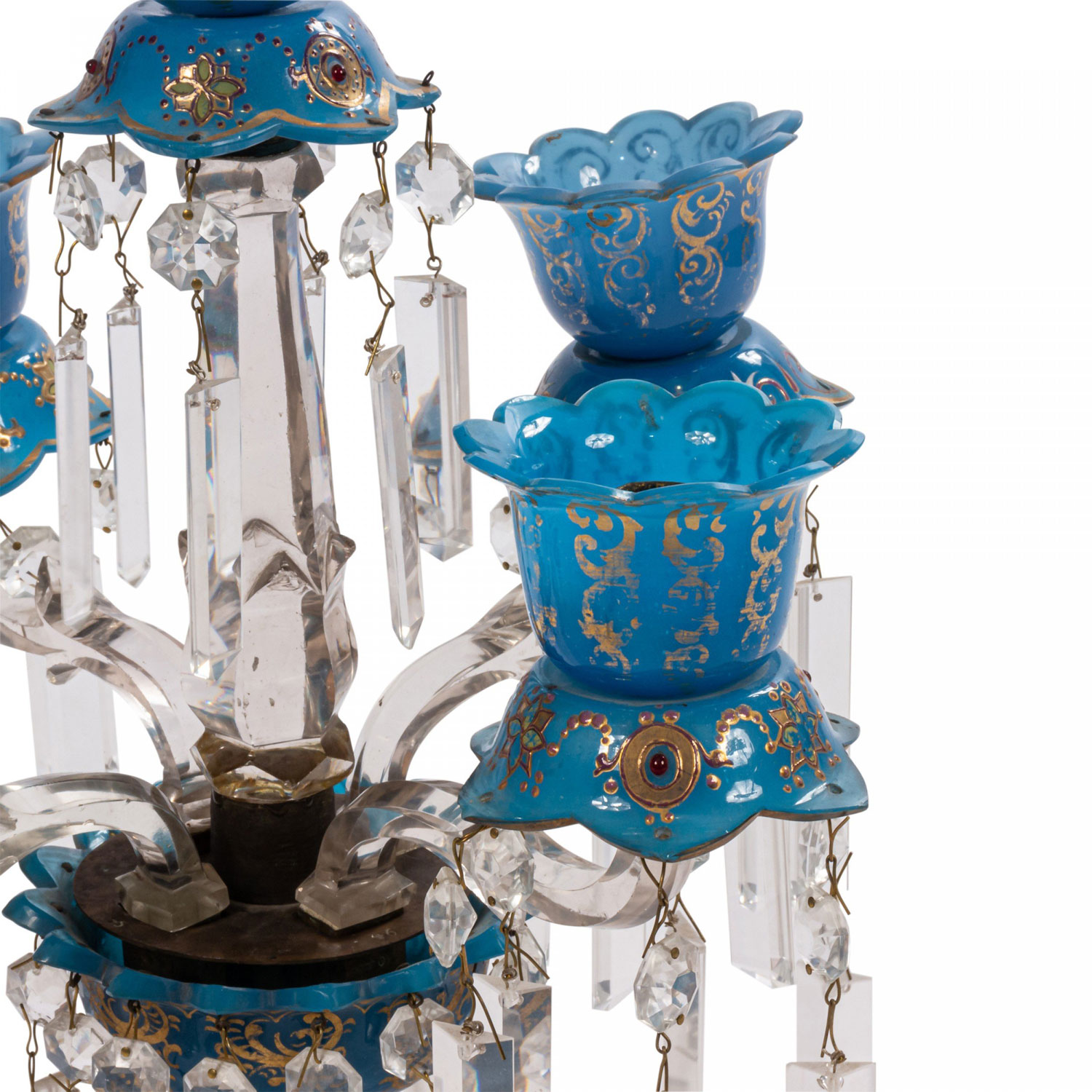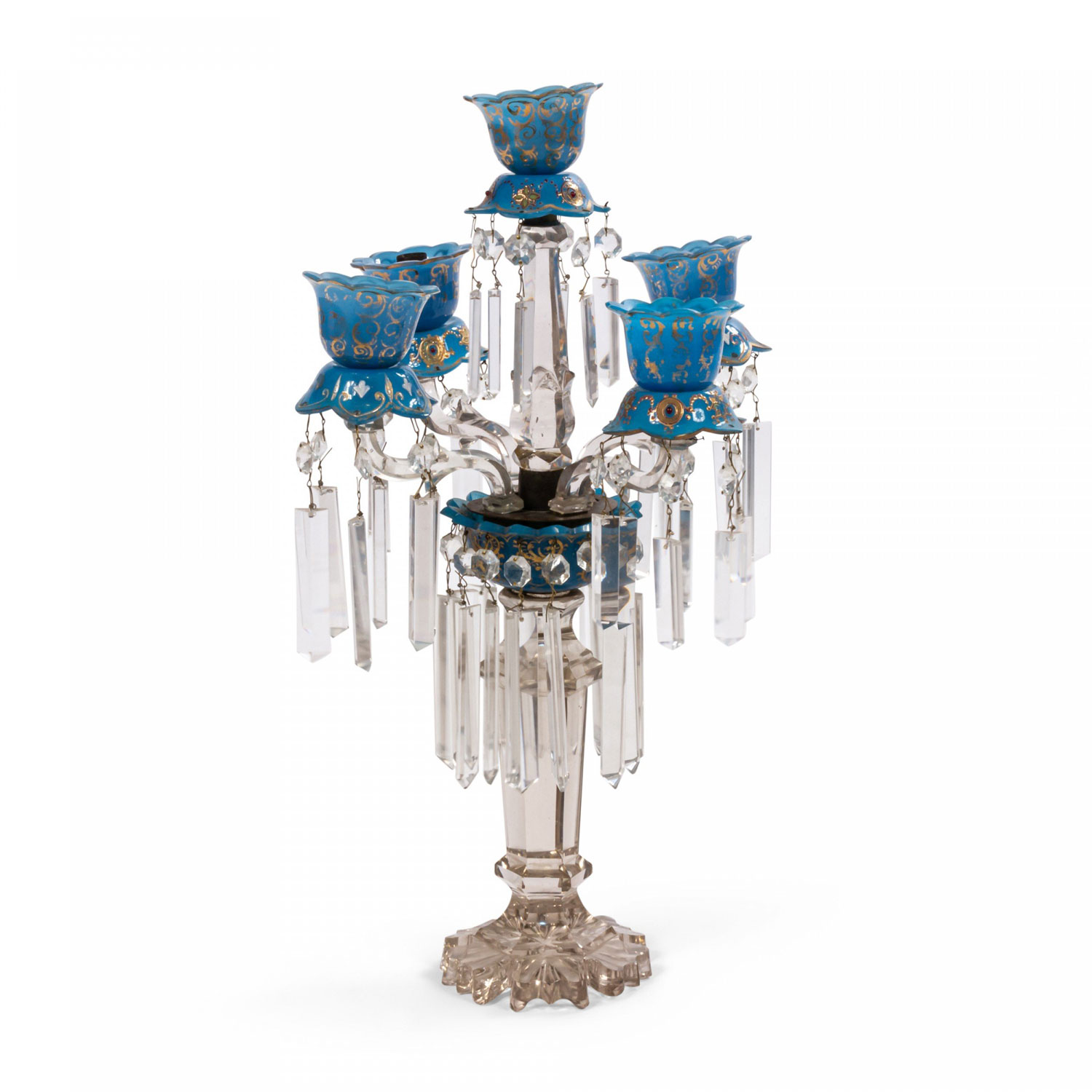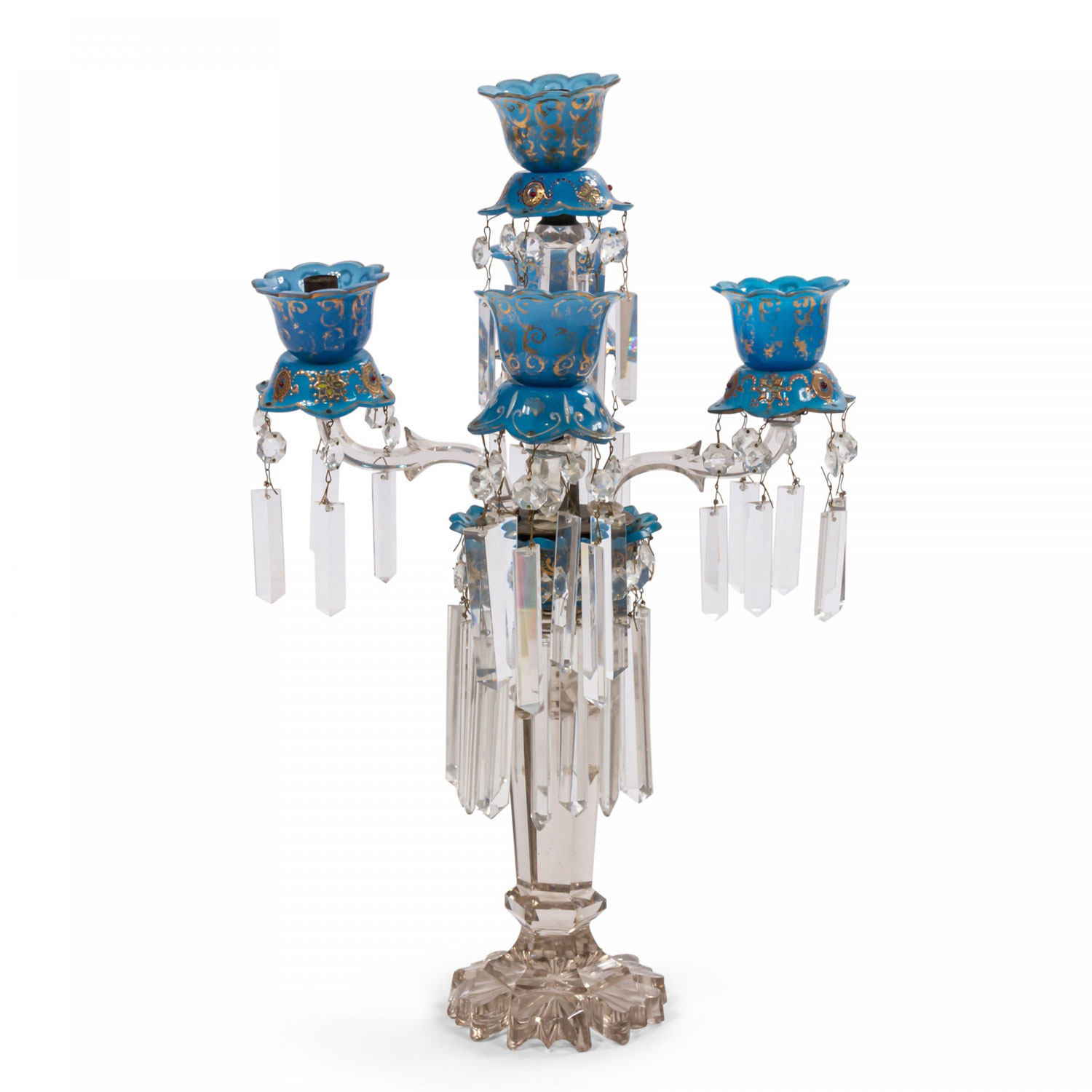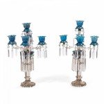 PAIR of similar English Victorian crystal and blue opaline Waterford style 5 arm candelabras (PRICED AS PAIR).