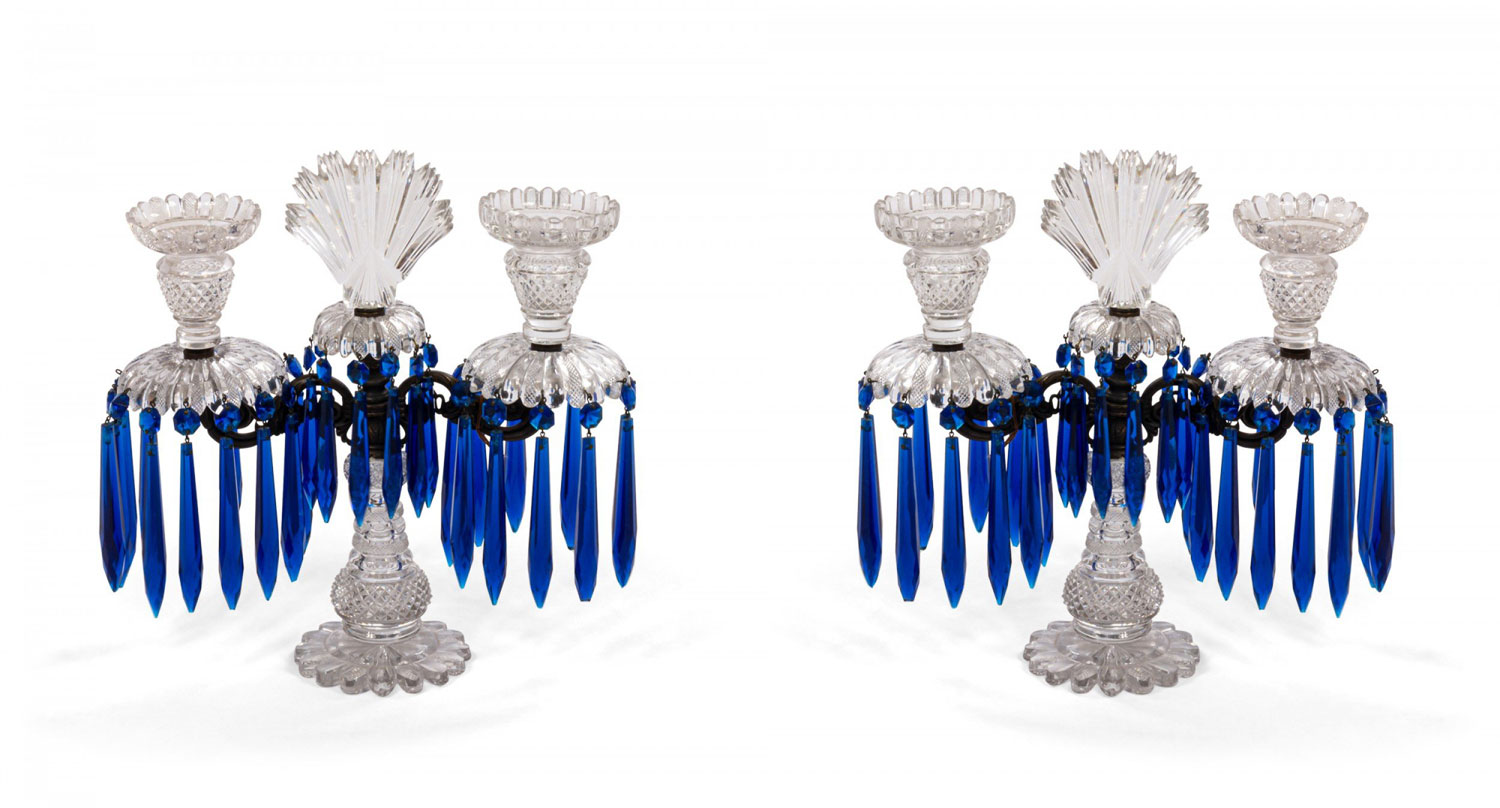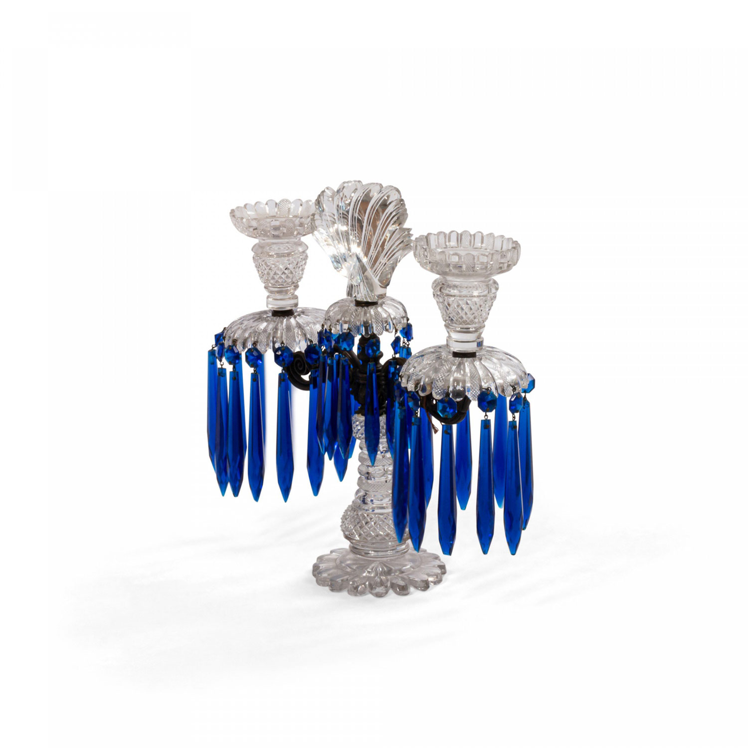 PAIR of English Victorian cut crystal candelabras with blue prisms and 2 arms supported by an iron scroll section under a fan shaped finial top with a scalloped base. (PRICED AS PAIR).