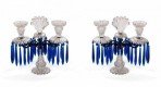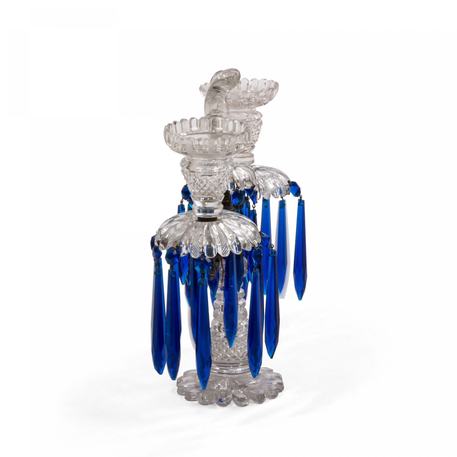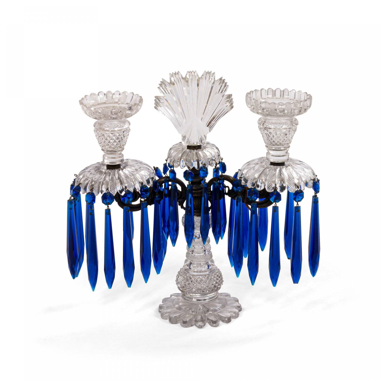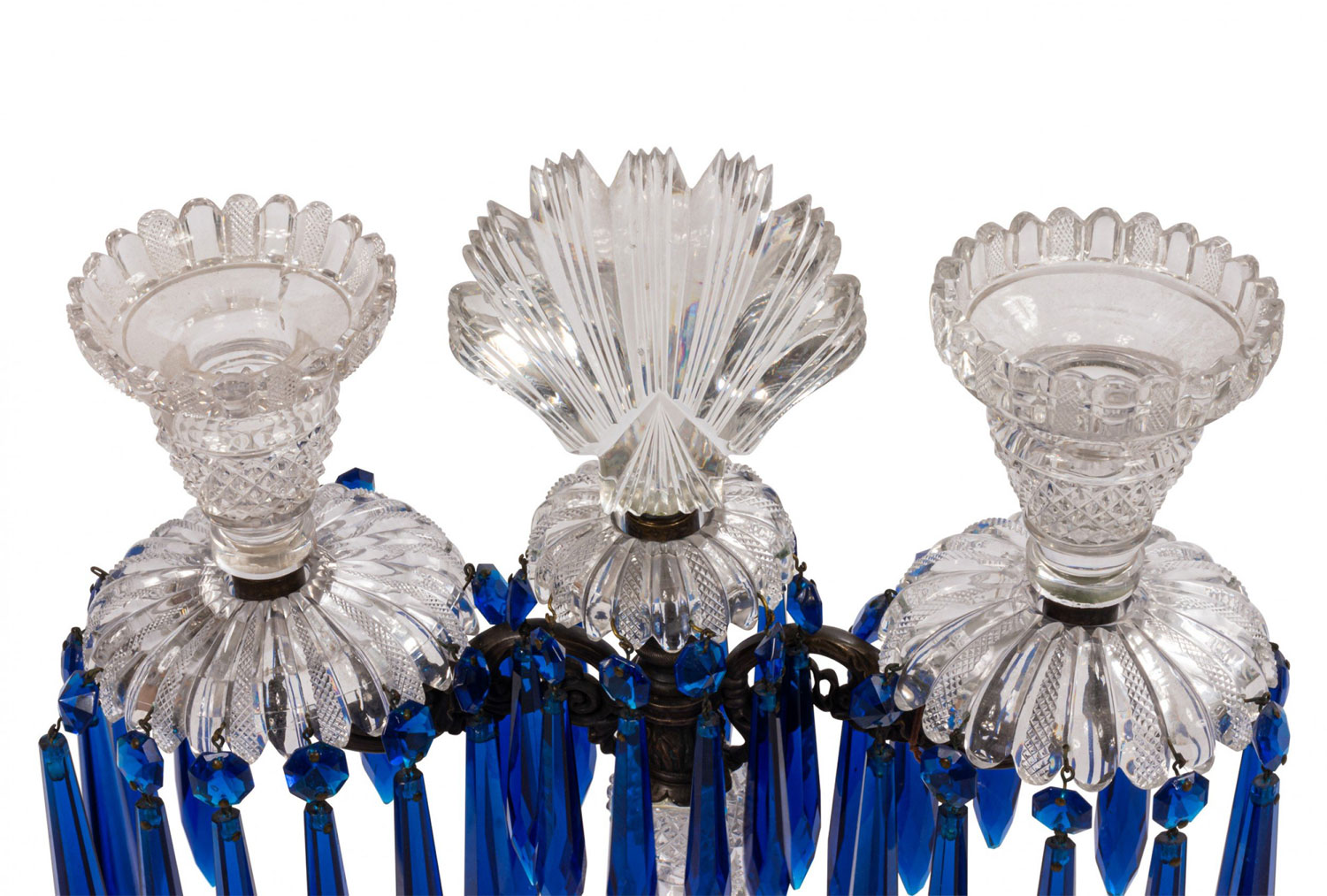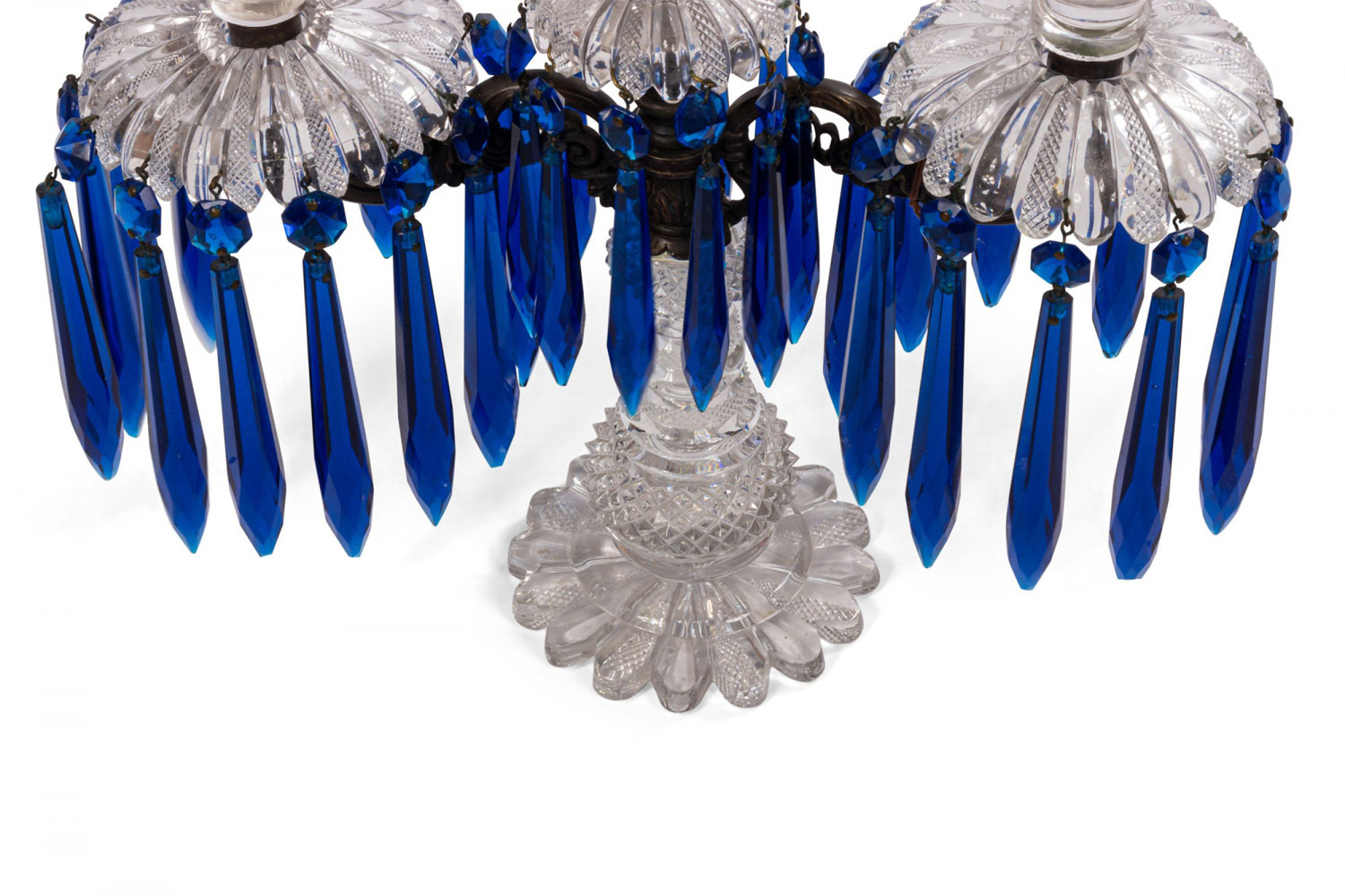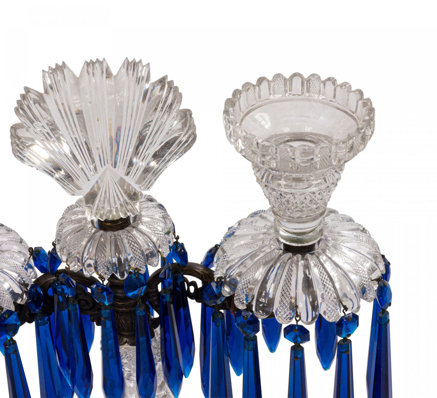 PAIR of English Victorian cut crystal candelabras with blue prisms and 2 arms supported by an iron scroll section under a fan shaped finial top with a scalloped base. (PRICED AS PAIR)
