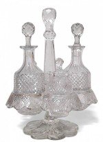 English Victorian cut crystal cruet set with 5 containers in scalloped holder.