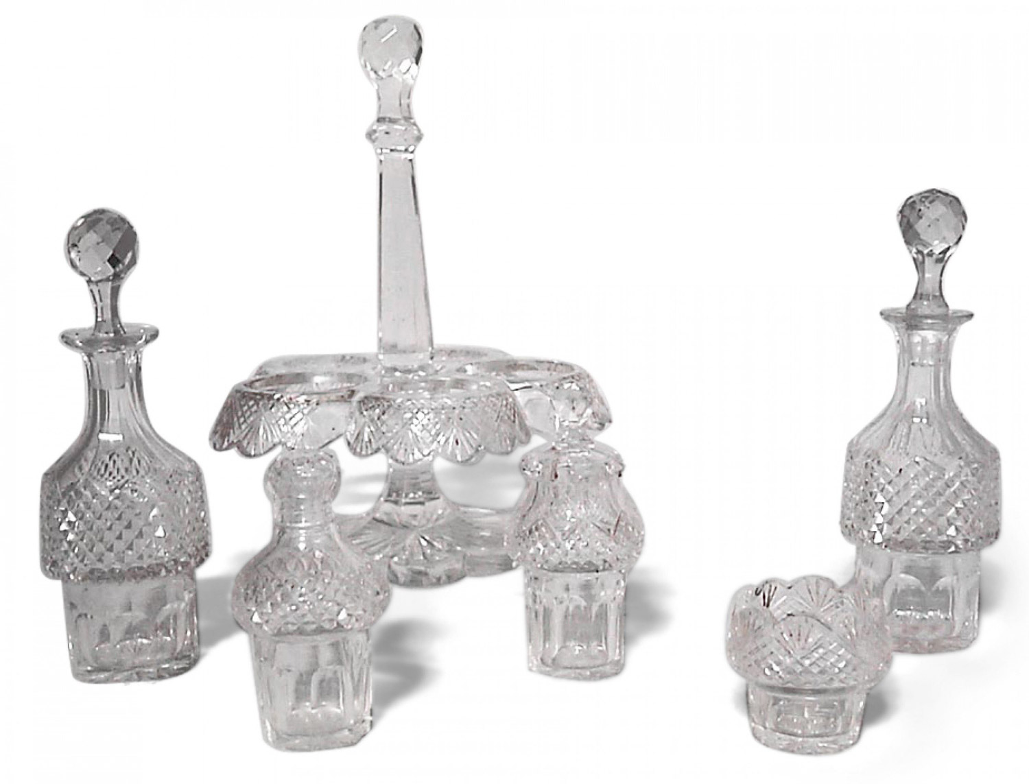 English Victorian cut crystal cruet set with 5 containers in scalloped holder