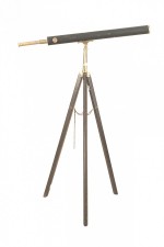 English Victorian ebonzied metal and brass trim telescope on adjustable dark stained tripod base (signed: WOOD, late ABRAHAM & CO, LIVERPOOL)