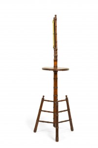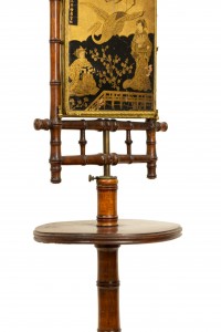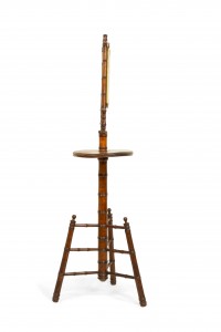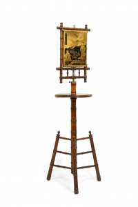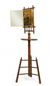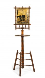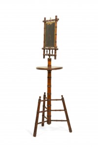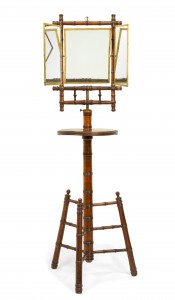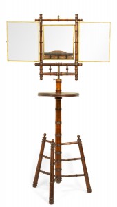English Victorian Aesthetic Movement faux bamboo shaving stand / dressing mirror with three mirrored triptych panels featuring a Chinoiserie decorated backing.