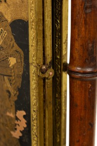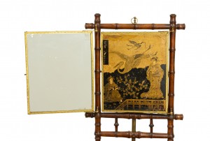 English Victorian Aesthetic Movement faux bamboo shaving stand / dressing mirror with three mirrored triptych panels featuring a Chinoiserie decorated backing..