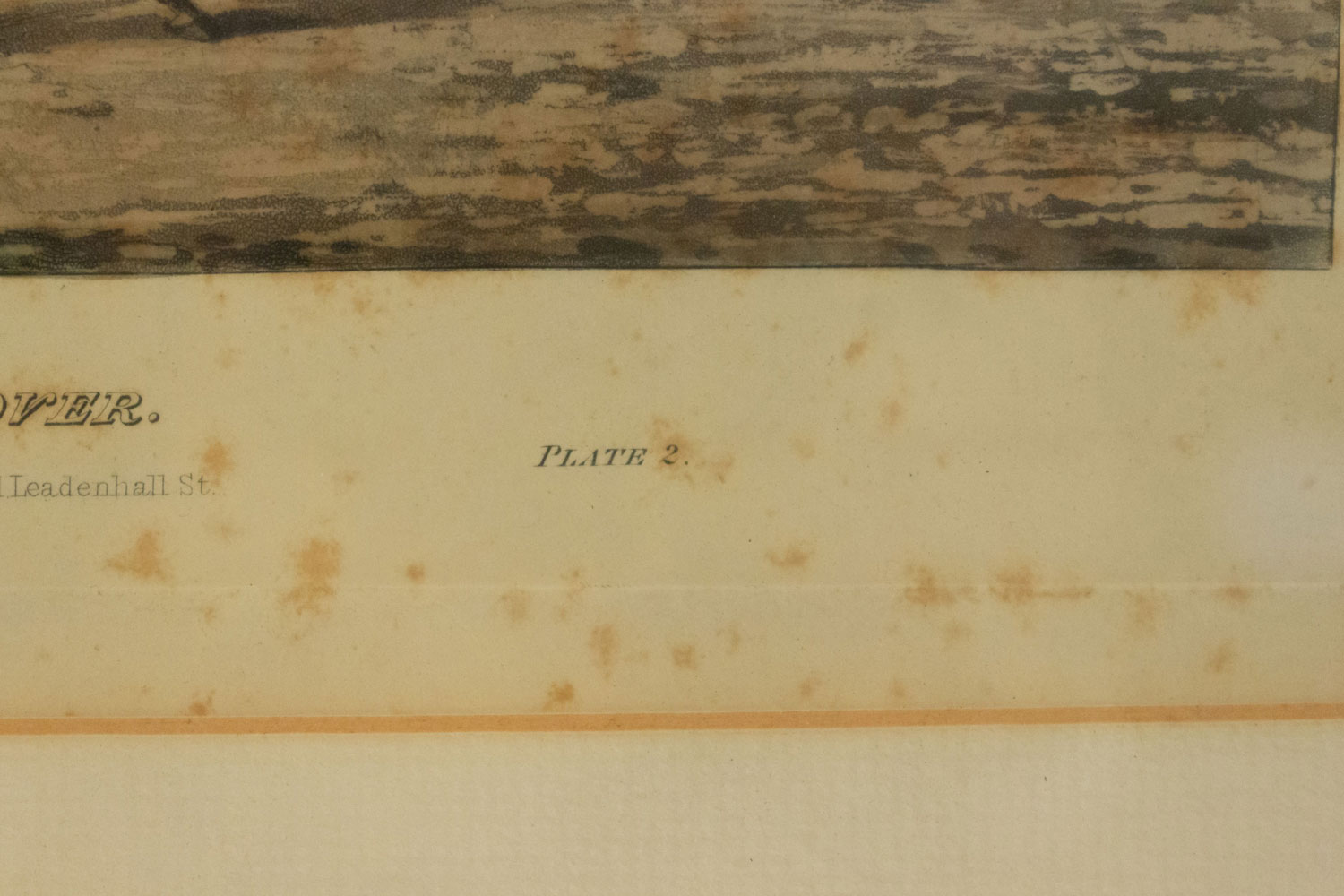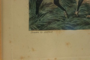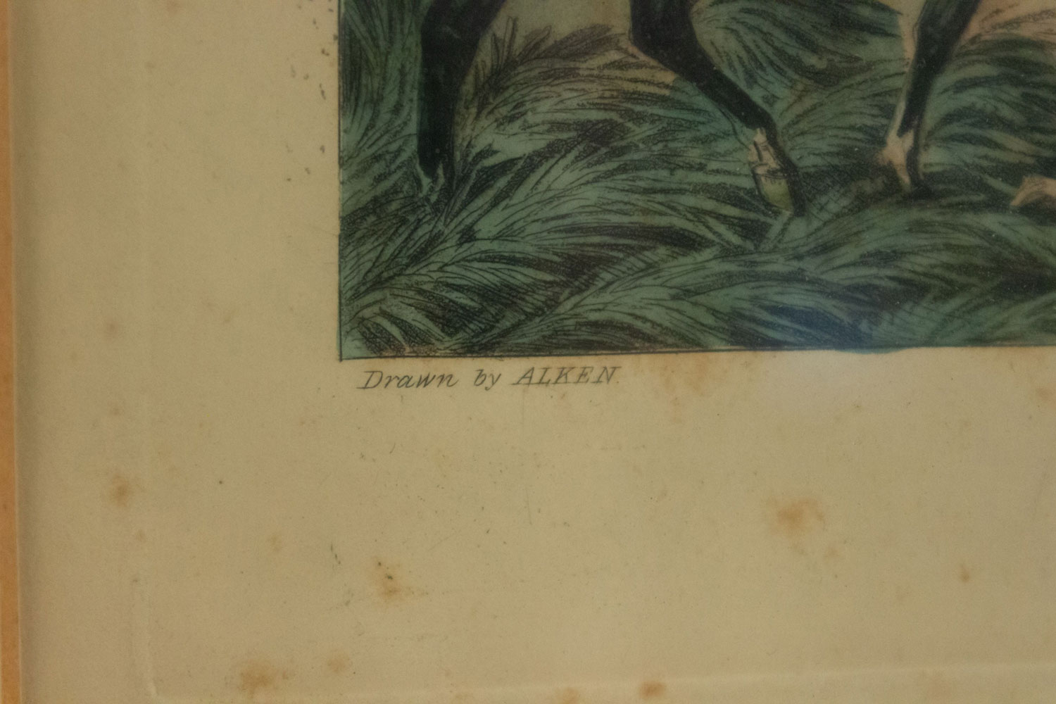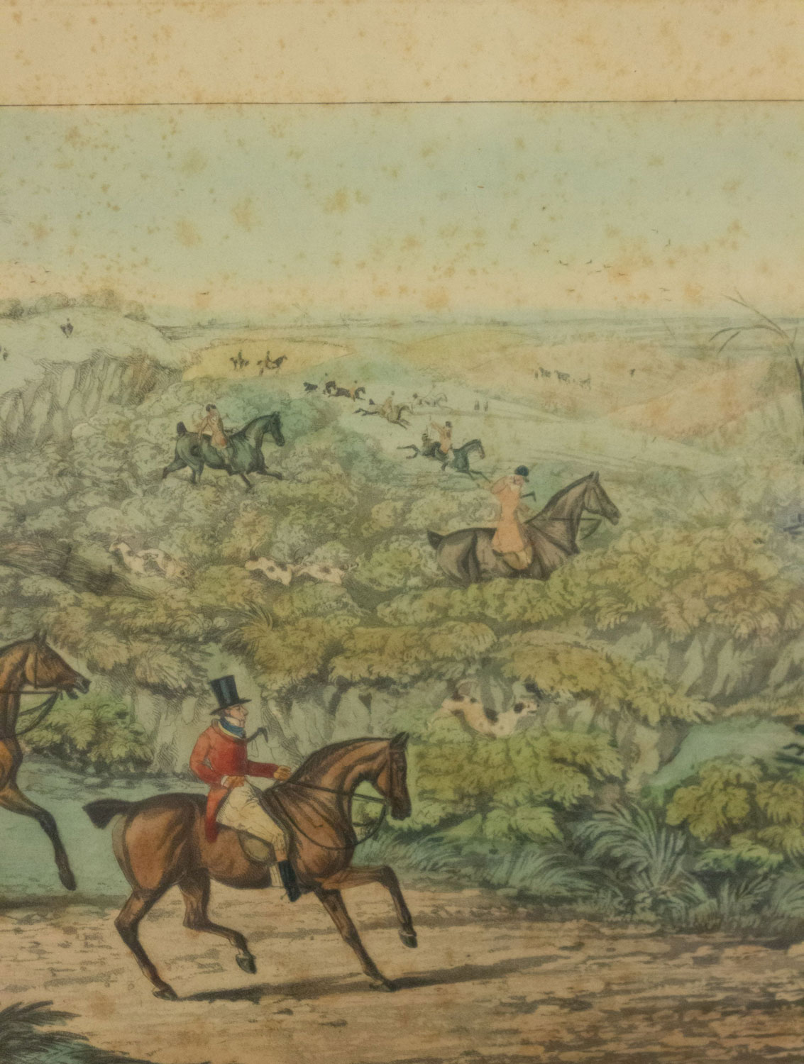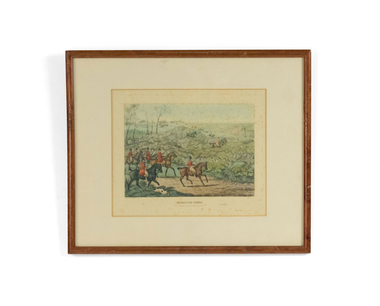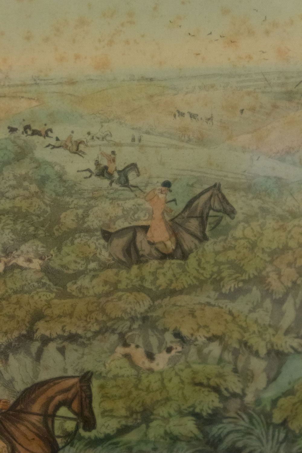 English Victorian (19th Cent) colored engraving of a foxhunting scene by Alken in an oak frame