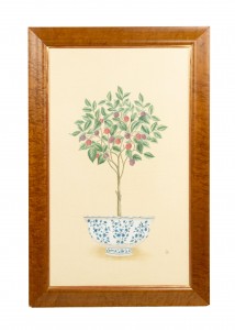 English Victorian style (modern) birds eye maple and gilt trimmed framed oil painting of a fruit tree in porcelain jardiniere Sold AS IS. (See related items for full set)