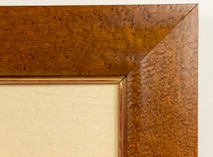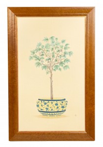 English Victorian style (modern) birds eye maple and gilt trimmed framed oil painting of a fruit tree in porcelain jardiniere Sold AS IS. (See related items for full set)
