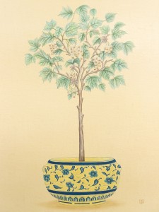 English Victorian style (modern) birds eye maple and gilt trimmed framed oil painting of a fruit tree in porcelain jardiniere Sold AS IS. (See related items for full set).